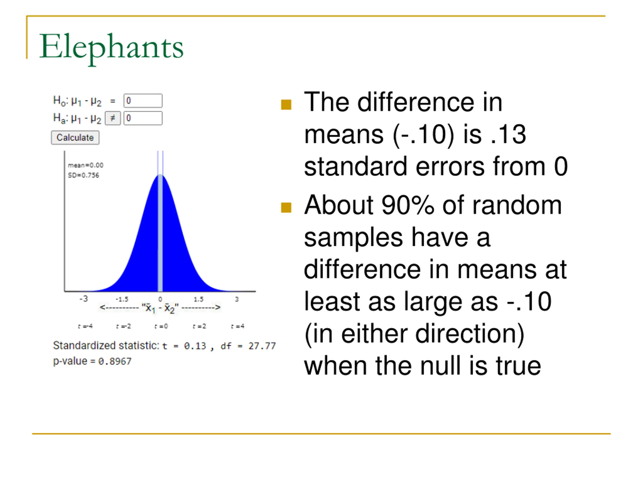Elephants The difference in means (-.10) is .13 standard errors from 0 About 90% of random samples have a difference in means at least as large as -.10 (in either direction) when the null is true