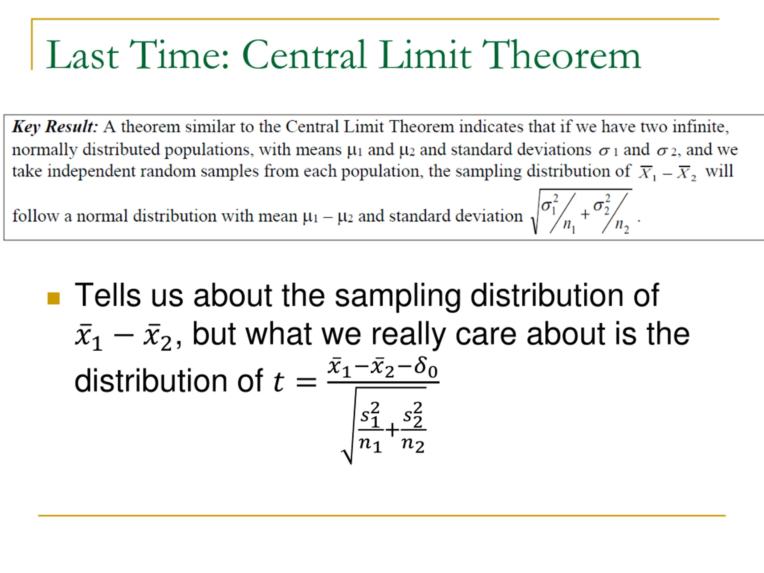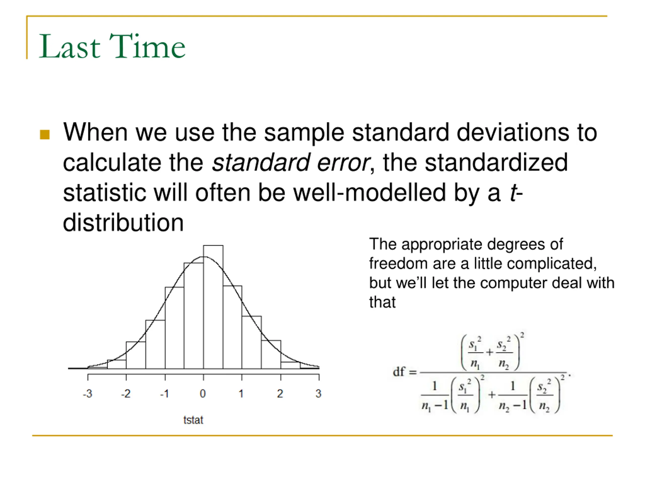 Last Time When we use the sample standard deviations to calculate the standard error, the standardized statistic will often be well-modelled by a t- distribution The appropriate degrees of freedom are a little complicated, but we ll let the computer deal with that
