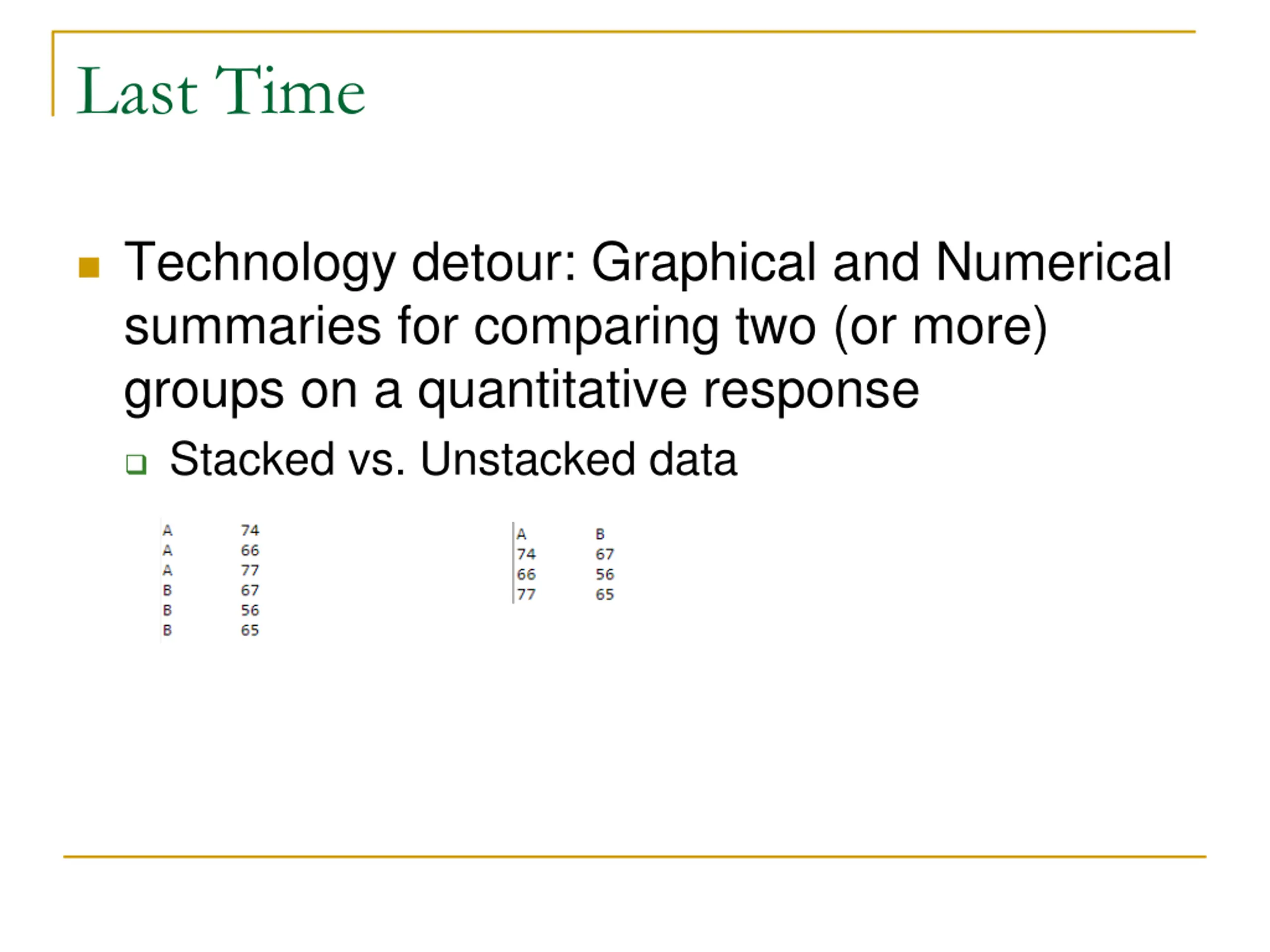 Last Time Technology detour: Graphical and Numerical summaries for comparing two (or more) groups on a quantitative response Stacked vs. Unstacked data