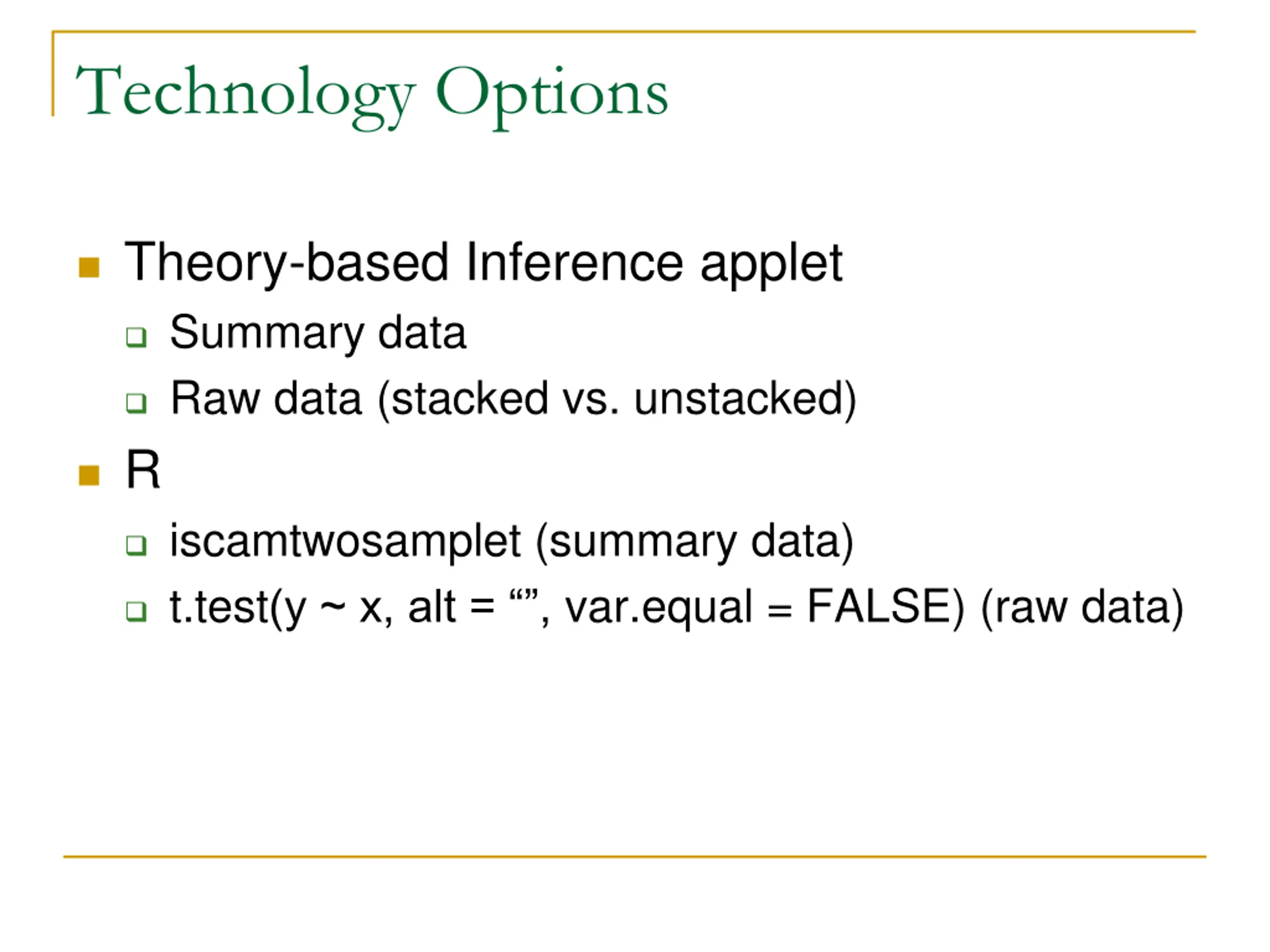 Technology Options Theory-based Inference applet Summary data Raw data (stacked vs. unstacked) R iscamtwosamplet (summary data) t.test(y ~ x, alt = , var.equal = FALSE) (raw data)