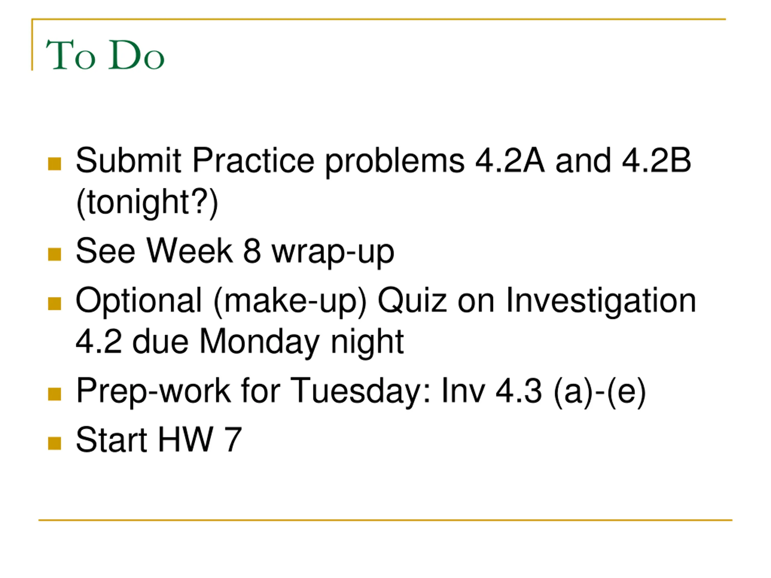 To Do Submit Practice problems 4.2A and 4.2B (tonight?) See Week 8 wrap-up Optional (make-up) Quiz on Investigation 4.2 due Monday night Prep-work for Tuesday: Inv 4.3 (a)-(e) Start HW 7