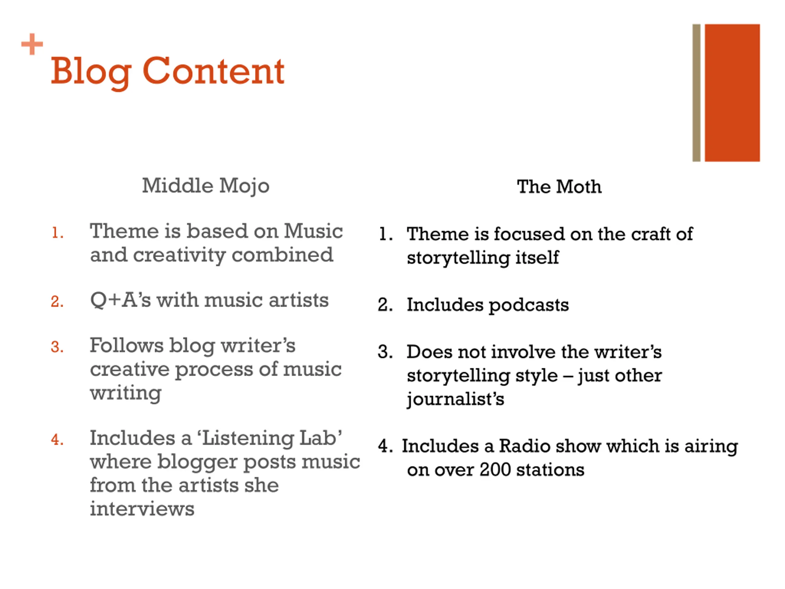 +Blog Content Middle Mojo The Moth Theme is based on Music and creativity combined 1. Theme is focused on the craft of storytelling itself 1. Q+A s with music artists 2. 2. Includes podcasts Follows blog writer s creative process of music writing 3. 3. Does not involve the writer s storytelling style just other journalist s Includes a Listening Lab where blogger posts music from the artists she interviews 4. 4. Includes a Radio show which is airing on over 200 stations