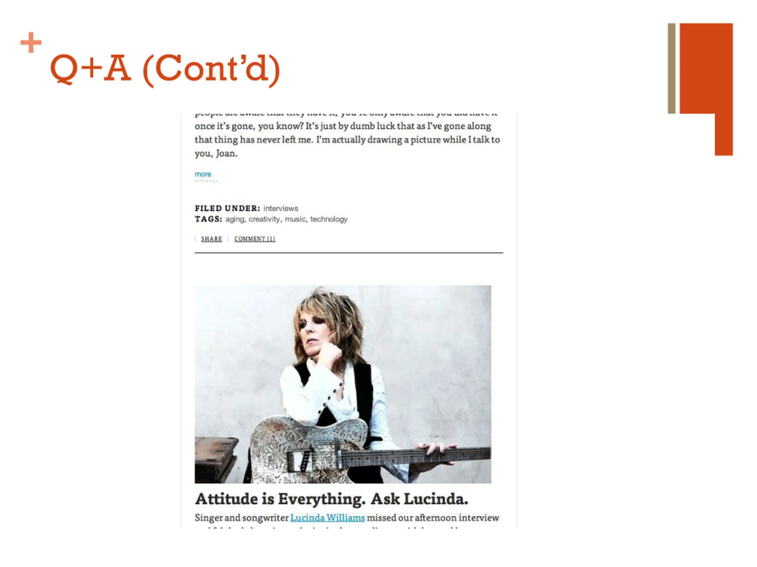 +MiddleMojo (Contd) The inside pages are convenient. Sufficient image to text ratio Open feel not cluttered. Interview page allows you to read a snippet of the interview before clicking on the entire transcription. Organized flow Aesthetically pleasing