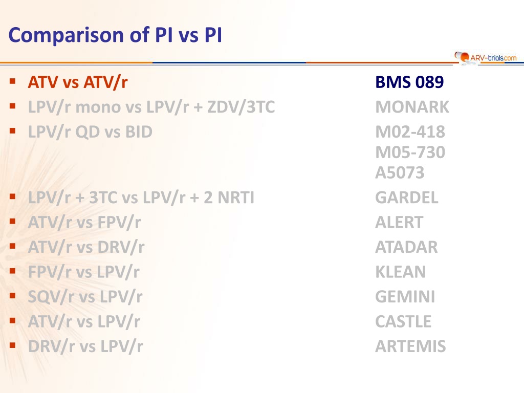 Comparison of PI vs PI ATV vs ATV/r LPV/r mono vs LPV/r + ZDV/3TC LPV/r QD vs BID BMS 089 MONARK M02-418 M05-730 A5073 GARDEL ALERT ATADAR KLEAN GEMINI CASTLE ARTEMIS LPV/r + 3TC vs LPV/r + 2 NRTI ATV/r vs FPV/r ATV/r vs DRV/r FPV/r vs LPV/r SQV/r vs LPV/r ATV/r vs LPV/r DRV/r vs LPV/r