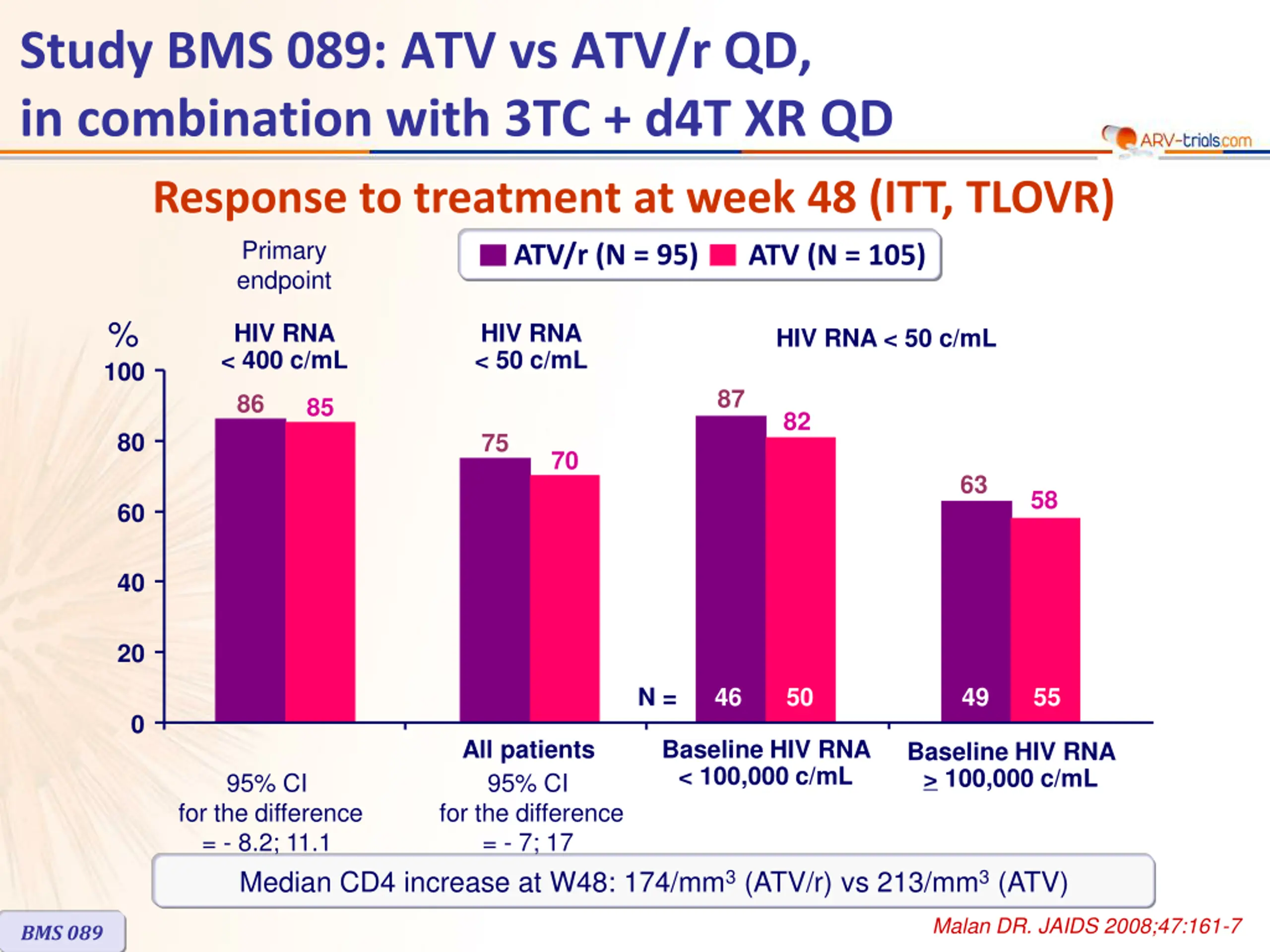 Study BMS 089: ATV vs ATV/r QD, in combination with 3TC + d4T XR QD Design Randomisation* 1 : 1 Open-label W48 ATV/r 300/100 mg QD 200 adults N = 95 ARV-na ve or < 30 days of prior NRTI or < 7 days of prior NNRTI or PI HIV RNA > 2,000 c/mL Any CD4 cell count 3TC + d4T XR QD ATV 400 mg BID N = 105 3TC + d4T XR QD *Randomisation was stratified on HIV RNA < or > 100,000 c/mL Objective Non inferiority of ATV/r 300/100 vs ATV 400 at W48: % HIV RNA < 400 c/mL, ITT, TLOVR algorithm (lower margin of the 95% CI for the difference = -10%, 80% power) Malan DR. JAIDS 2008;47:161-7 BMS 089
