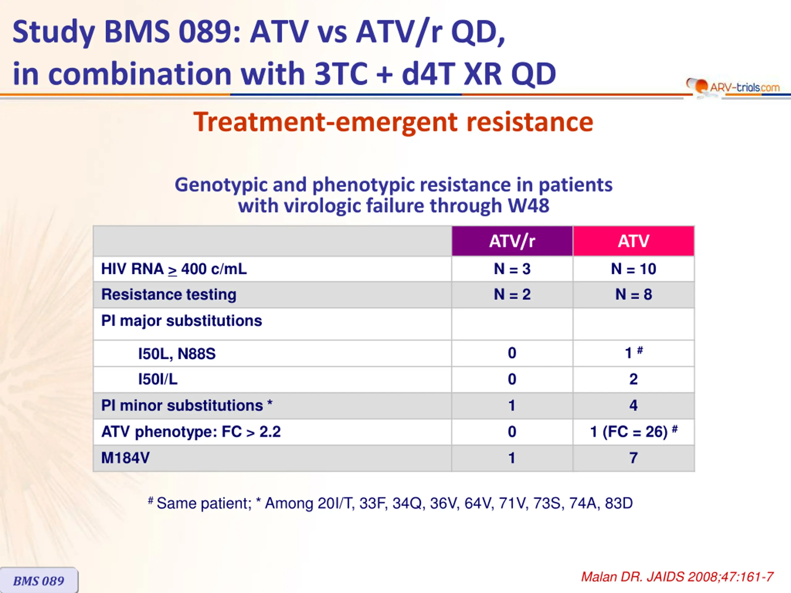 Study BMS 089: ATV vs ATV/r QD, in combination with 3TC + d4T XR QD Treatment-emergent resistance Genotypic and phenotypic resistance in patients with virologic failure through W48 ATV/r N = 3 N = 2 ATV N = 10 N = 8 HIV RNA > 400 c/mL Resistance testing PI major substitutions 0 1 # I50L, N88S I50I/L 0 2 PI minor substitutions * 1 4 ATV phenotype: FC > 2.2 0 1 (FC = 26) # M184V 1 7 # Same patient; * Among 20I/T, 33F, 34Q, 36V, 64V, 71V, 73S, 74A, 83D Malan DR. JAIDS 2008;47:161-7 BMS 089