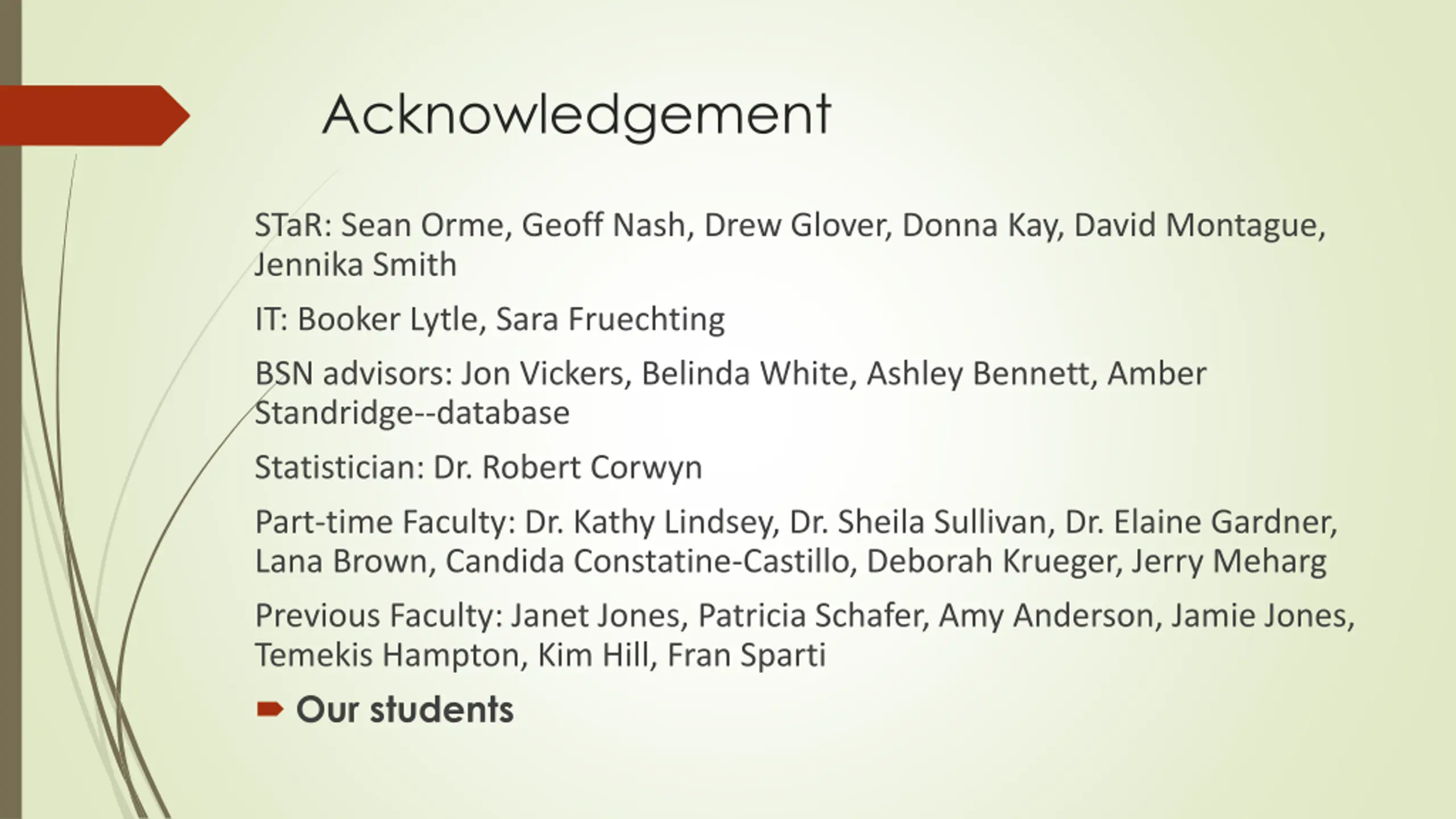 Acknowledgement STaR: Sean Orme, Geoff Nash, Drew Glover, Donna Kay, David Montague, Jennika Smith IT: Booker Lytle, Sara Fruechting BSN advisors: Jon Vickers, Belinda White, Ashley Bennett, Amber Standridge--database Statistician: Dr. Robert Corwyn Part-time Faculty: Dr. Kathy Lindsey, Dr. Sheila Sullivan, Dr. Elaine Gardner, Lana Brown, Candida Constatine-Castillo, Deborah Krueger, Jerry Meharg Previous Faculty: Janet Jones, Patricia Schafer, Amy Anderson, Jamie Jones, Temekis Hampton, Kim Hill, Fran Sparti Our students