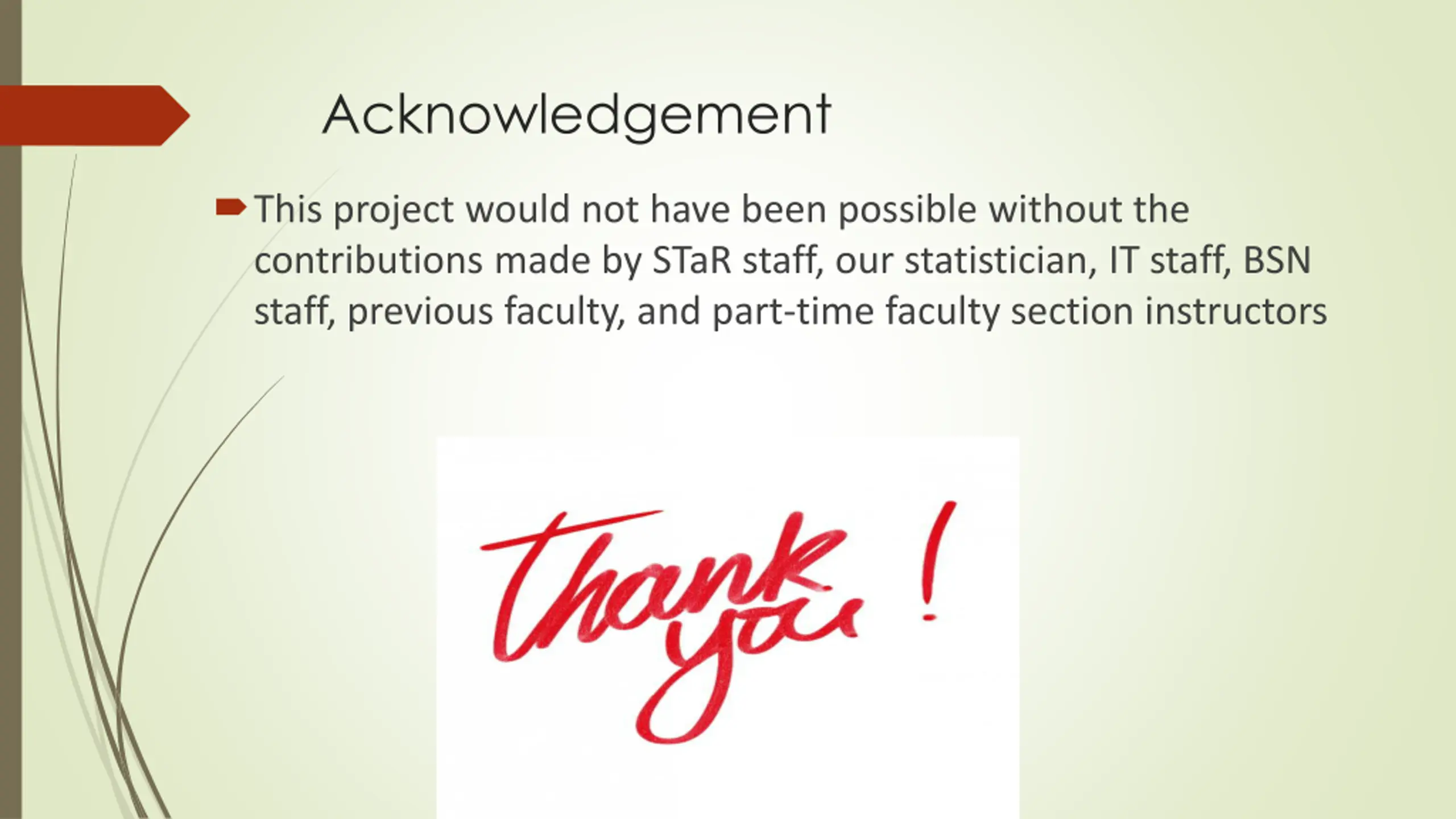 Acknowledgement This project would not have been possible without the contributions made by STaR staff, our statistician, IT staff, BSN staff, previous faculty, and part-time faculty section instructors