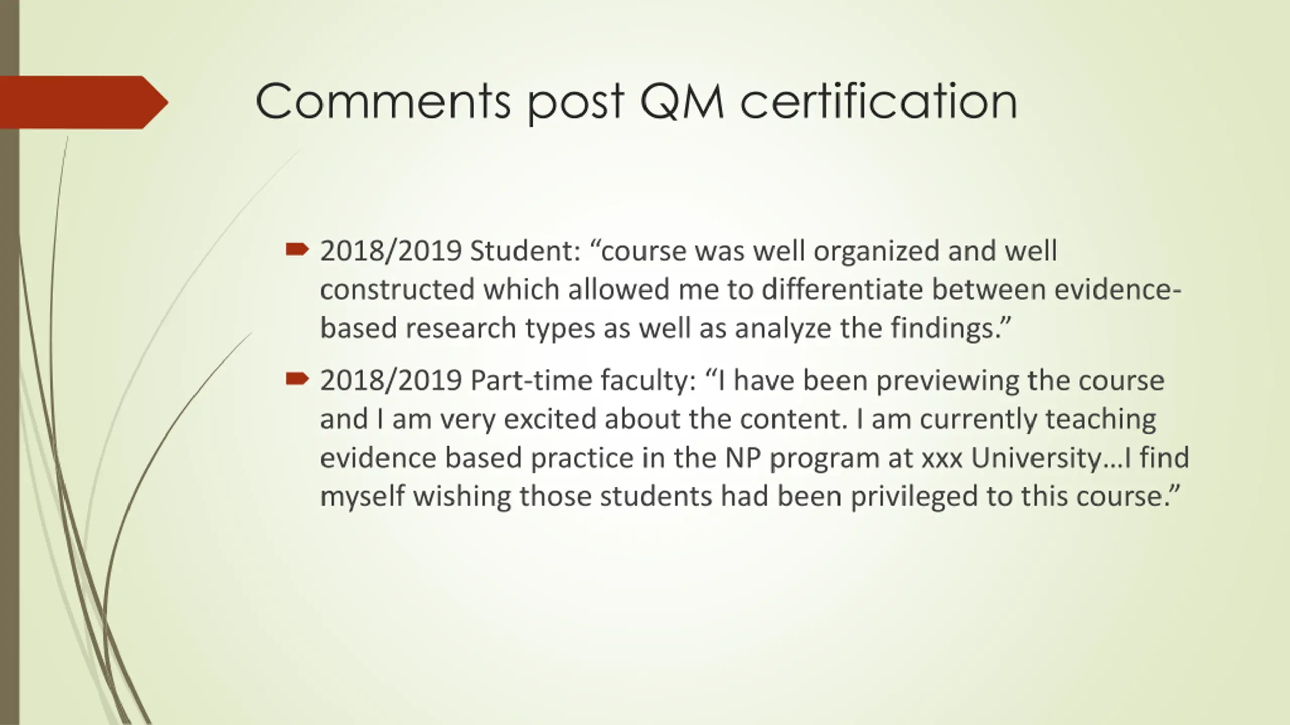 Comments post QM certification 2018/2019 Student: course was well organized and well constructed which allowed me to differentiate between evidence- based research types as well as analyze the findings. 2018/2019 Part-time faculty: I have been previewing the course and I am very excited about the content. I am currently teaching evidence based practice in the NP program at xxx University I find myself wishing those students had been privileged to this course.
