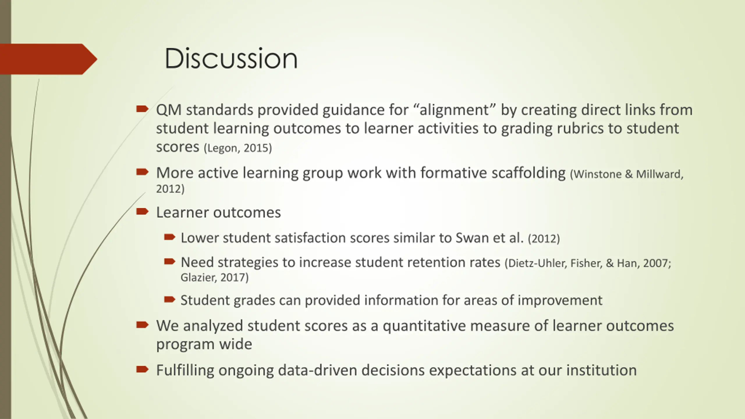 Discussion QM standards provided guidance for alignment by creating direct links from student learning outcomes to learner activities to grading rubrics to student scores (Legon, 2015) More active learning group work with formative scaffolding (Winstone & Millward, 2012) Learner outcomes Lower student satisfaction scores similar to Swan et al. (2012) Need strategies to increase student retention rates (Dietz-Uhler, Fisher, & Han, 2007; Glazier, 2017) Student grades can provided information for areas of improvement We analyzed student scores as a quantitative measure of learner outcomes program wide Fulfilling ongoing data-driven decisions expectations at our institution