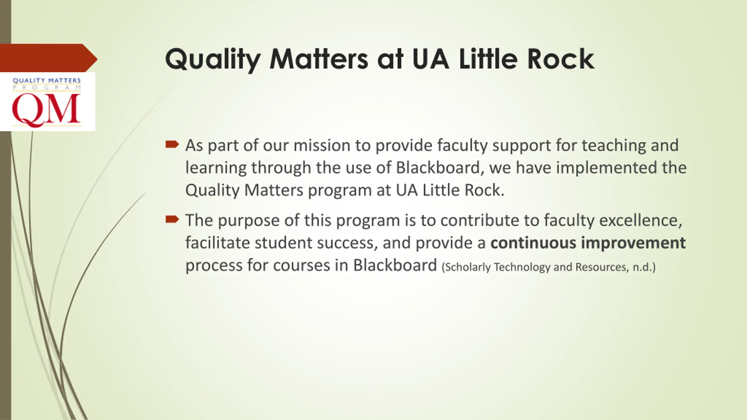Quality Matters at UA Little Rock As part of our mission to provide faculty support for teaching and learning through the use of Blackboard, we have implemented the Quality Matters program at UA Little Rock. The purpose of this program is to contribute to faculty excellence, facilitate student success, and provide a continuous improvement process for courses in Blackboard (Scholarly Technology and Resources, n.d.)