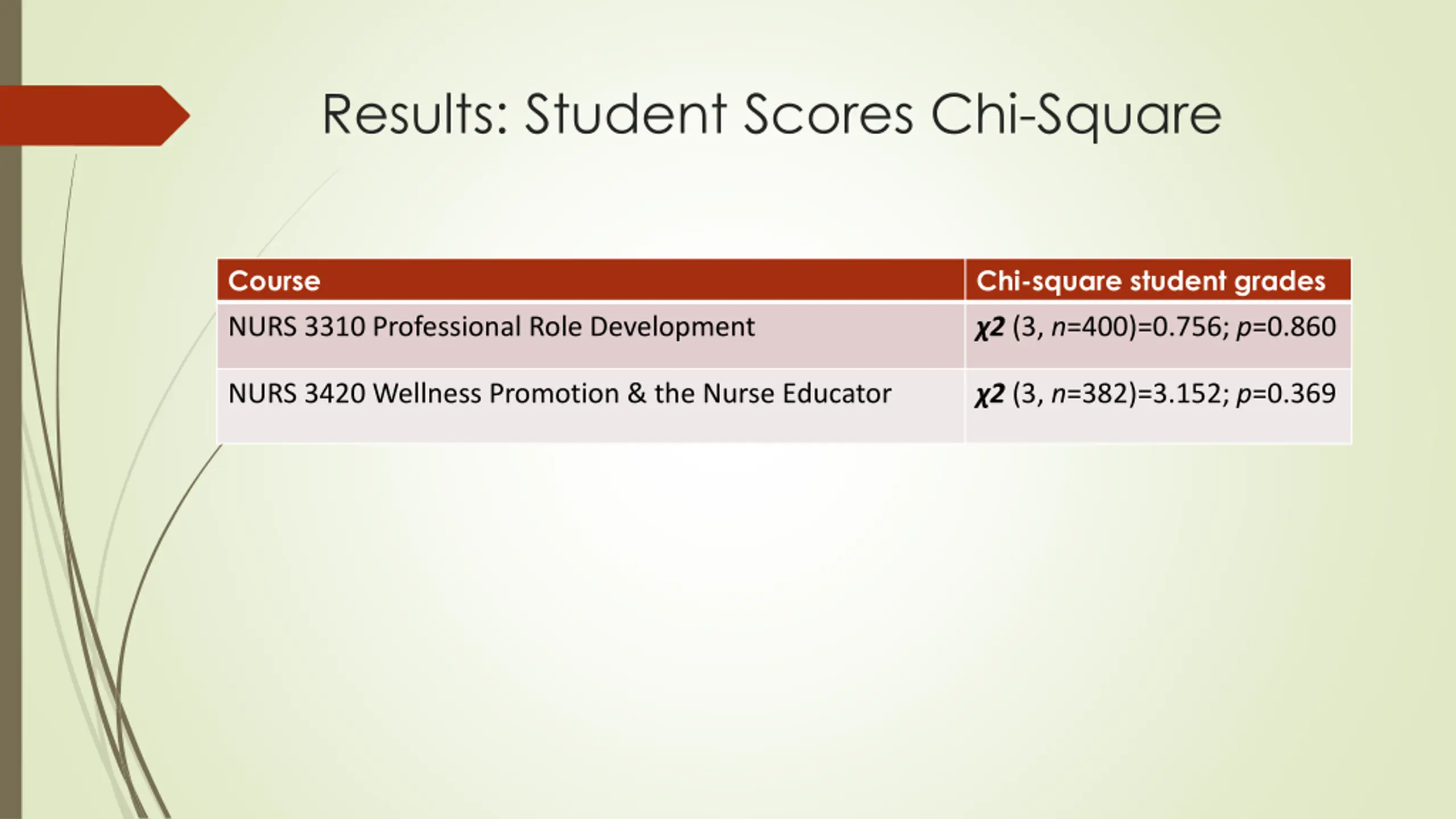 Results: Student Scores Chi-Square Course Chi-square student grades NURS 3310 Professional Role Development 2 (3, n=400)=0.756; p=0.860 NURS 3420 Wellness Promotion & the Nurse Educator 2 (3, n=382)=3.152; p=0.369