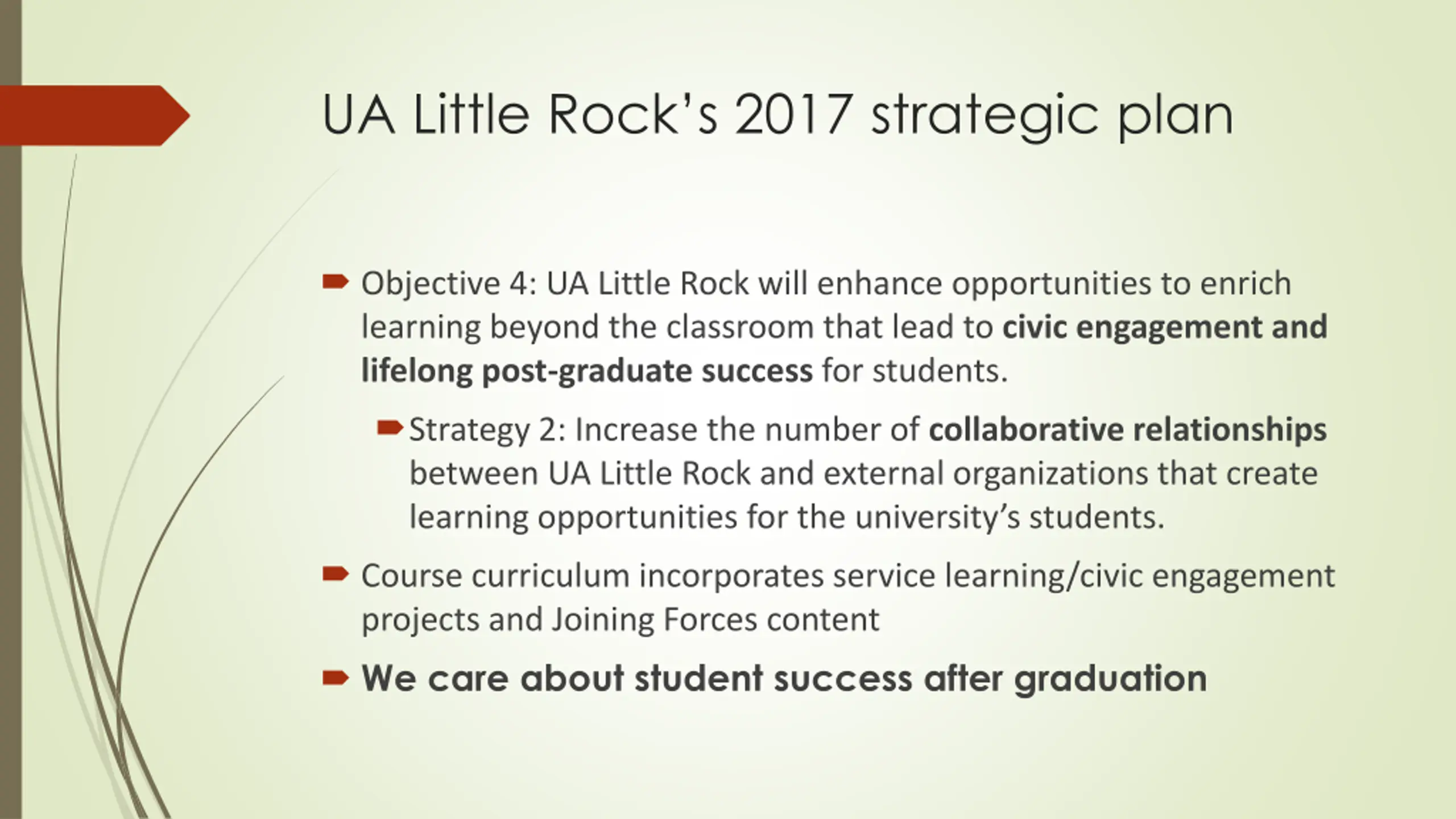UA Little Rocks 2017 strategic plan Objective 4: UA Little Rock will enhance opportunities to enrich learning beyond the classroom that lead to civic engagement and lifelong post-graduate success for students. Strategy 2: Increase the number of collaborative relationships between UA Little Rock and external organizations that create learning opportunities for the university s students. Course curriculum incorporates service learning/civic engagement projects and Joining Forces content We care about student success after graduation