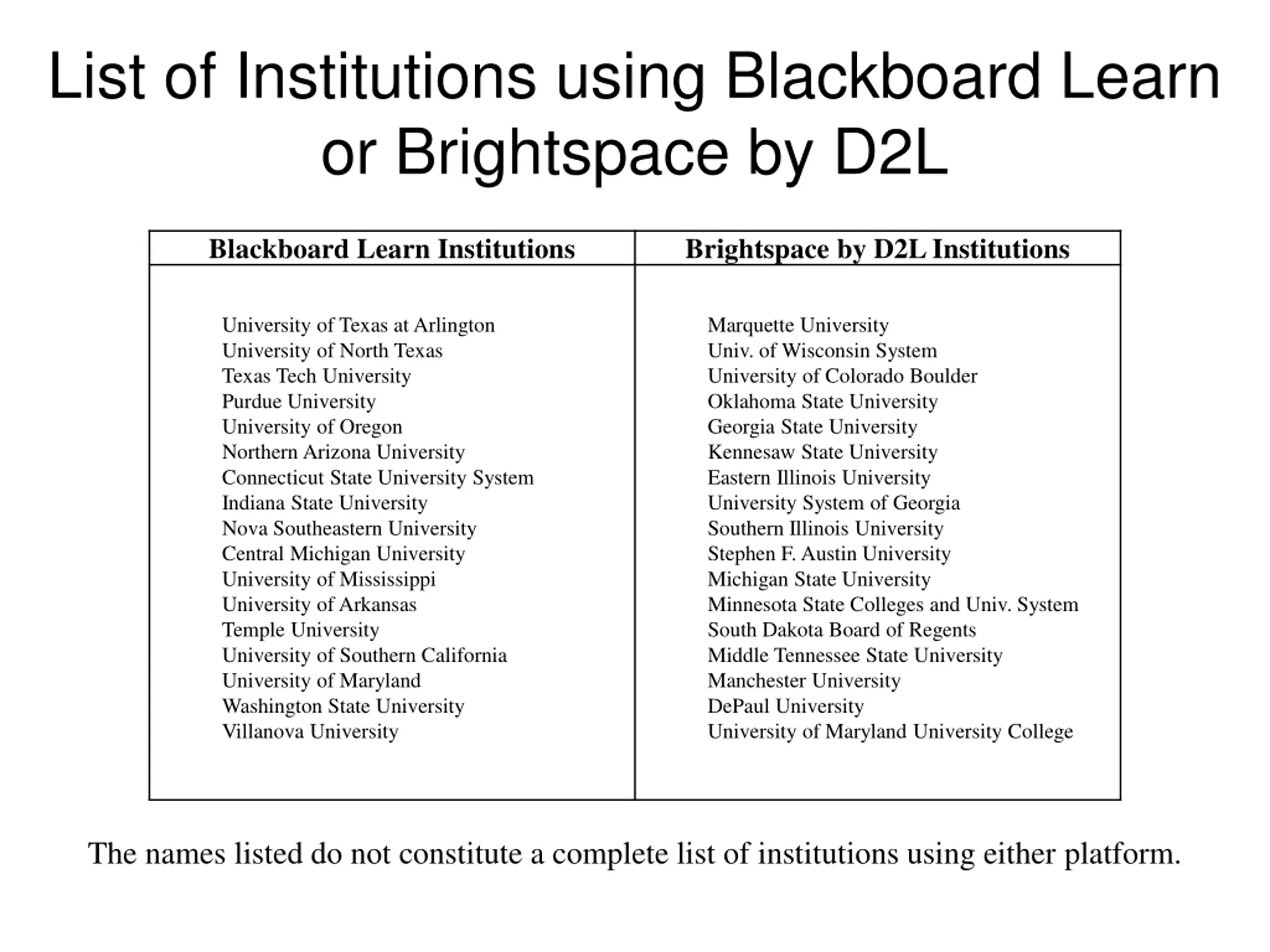 List of Institutions using Blackboard Learn or Brightspace by D2L Blackboard Learn Institutions Brightspace by D2L Institutions University of Texas at Arlington University of North Texas Texas Tech University Purdue University University of Oregon Northern Arizona University Connecticut State University System Indiana State University Nova Southeastern University Central Michigan University University of Mississippi University of Arkansas Temple University University of Southern California University of Maryland Washington State University Villanova University Marquette University Univ. of Wisconsin System University of Colorado Boulder Oklahoma State University Georgia State University Kennesaw State University Eastern Illinois University University System of Georgia Southern Illinois University Stephen F. Austin University Michigan State University Minnesota State Colleges and Univ. System South Dakota Board of Regents Middle Tennessee State University Manchester University DePaul University University of Maryland University College The names listed do not constitute a complete list of institutions using either platform.