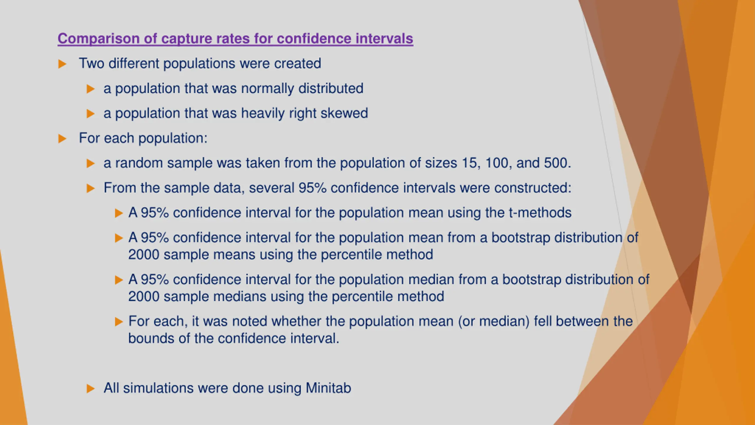 Comparison of capture rates for confidence intervals Two different populations were created a population that was normally distributed a population that was heavily right skewed For each population: a random sample was taken from the population of sizes 15, 100, and 500. From the sample data, several 95% confidence intervals were constructed: A 95% confidence interval for the population mean using the t-methods A 95% confidence interval for the population mean from a bootstrap distribution of 2000 sample means using the percentile method A 95% confidence interval for the population median from a bootstrap distribution of 2000 sample medians using the percentile method For each, it was noted whether the population mean (or median) fell between the bounds of the confidence interval. All simulations were done using Minitab