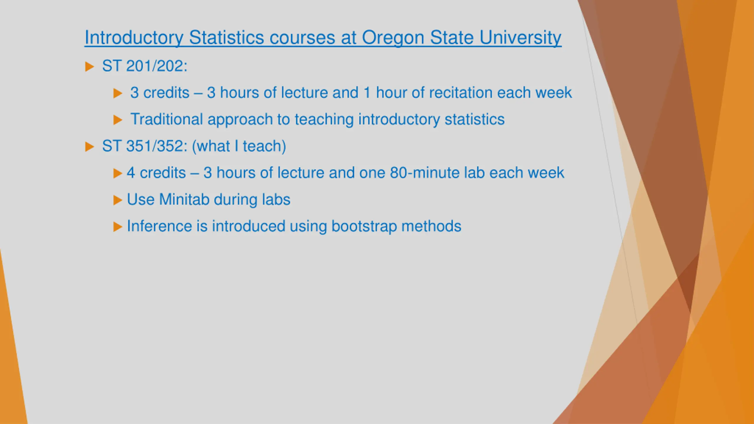 Introductory Statistics courses at Oregon State University ST 201/202: 3 credits 3 hours of lecture and 1 hour of recitation each week Traditional approach to teaching introductory statistics ST 351/352: (what I teach) 4 credits 3 hours of lecture and one 80-minute lab each week Use Minitab during labs Inference is introduced using bootstrap methods