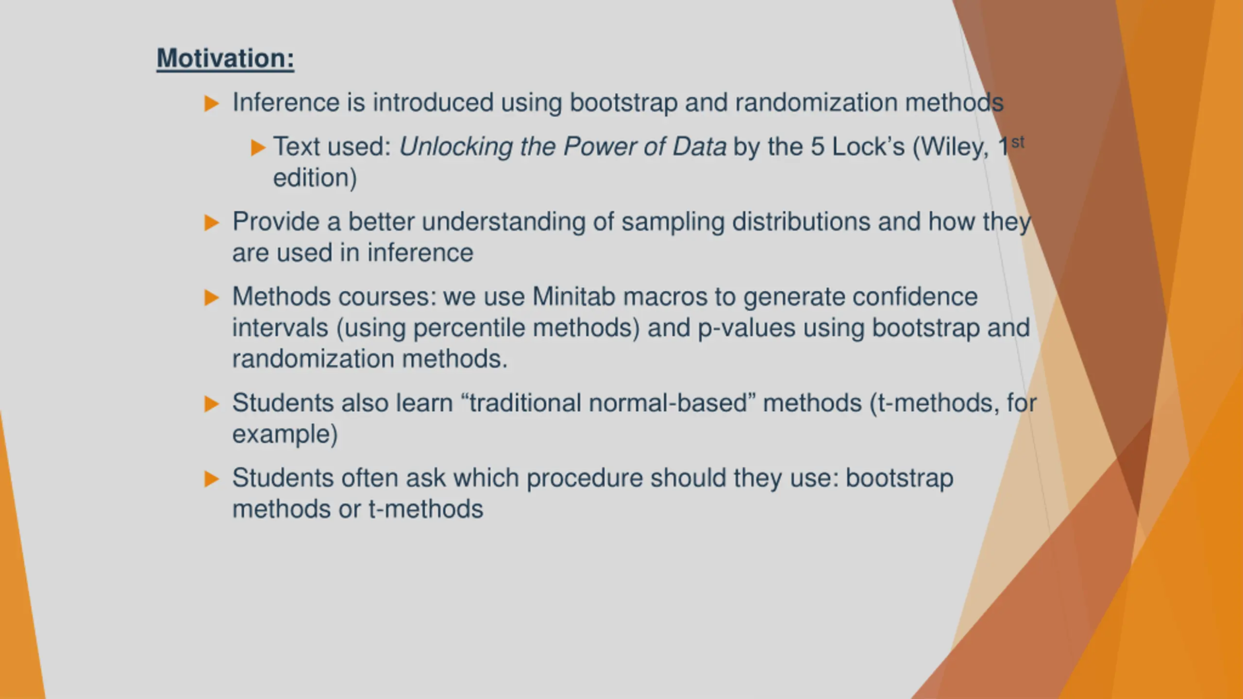 Motivation: Inference is introduced using bootstrap and randomization methods Text used: Unlocking the Power of Data by the 5 Lock s (Wiley, 1st edition) Provide a better understanding of sampling distributions and how they are used in inference Methods courses: we use Minitab macros to generate confidence intervals (using percentile methods) and p-values using bootstrap and randomization methods. Students also learn traditional normal-based methods (t-methods, for example) Students often ask which procedure should they use: bootstrap methods or t-methods