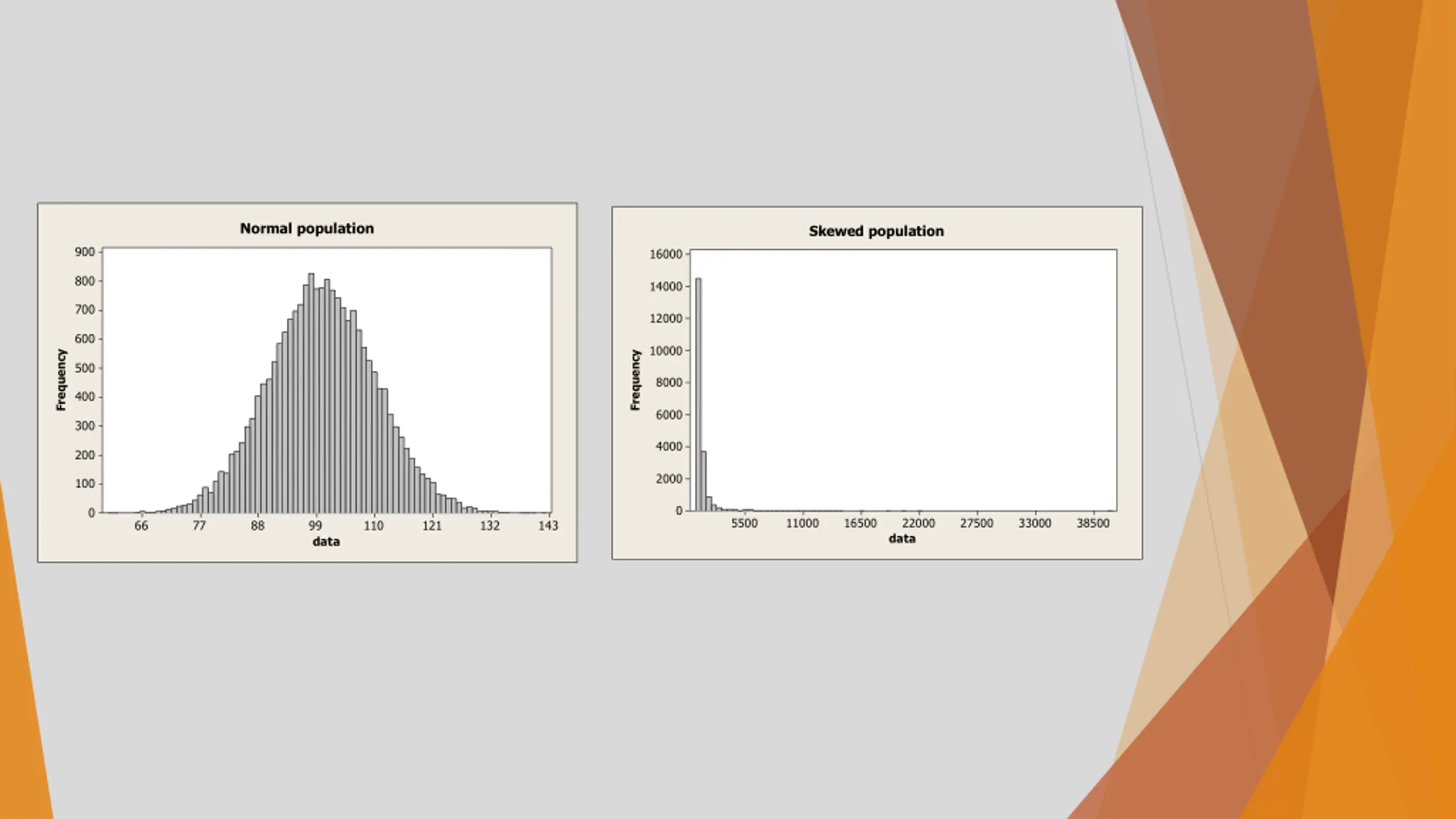 Normal population Skewed population 900 16000 800 14000 700 12000 600 10000 Frequency Frequency 500 8000 400 6000 300 4000 200 2000 100 0 0 5500 11000 16500 22000 data 27500 33000 38500 66 77 88 99 data 110 121 132 143