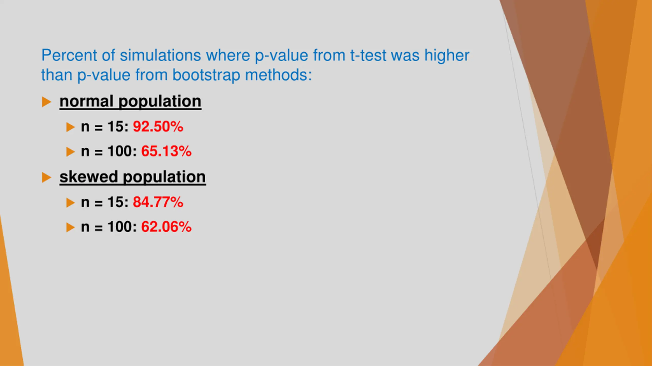Percent of simulations where p-value from t-test was higher than p-value from bootstrap methods: normal population n = 15: 92.50% n = 100: 65.13% skewed population n = 15: 84.77% n = 100: 62.06%