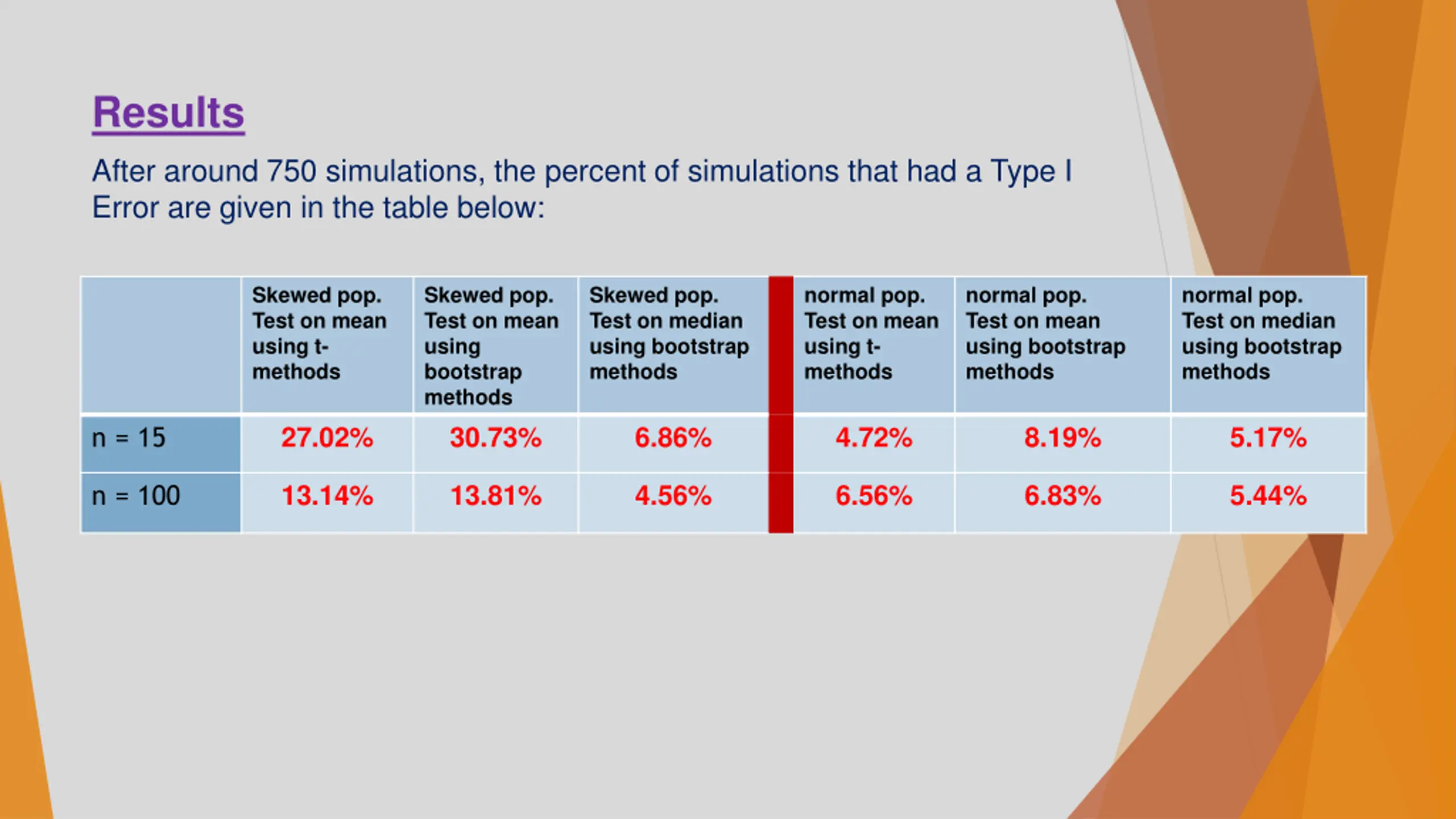 Results After around 750 simulations, the percent of simulations that had a Type I Error are given in the table below: Skewed pop. Test on mean using t- methods Skewed pop. Test on mean using bootstrap methods 30.73% Skewed pop. Test on median using bootstrap methods normal pop. Test on mean using t- methods normal pop. Test on mean using bootstrap methods normal pop. Test on median using bootstrap methods 27.02% 6.86% 4.72% 8.19% 5.17% n = 15 13.14% 13.81% 4.56% 6.56% 6.83% 5.44% n = 100