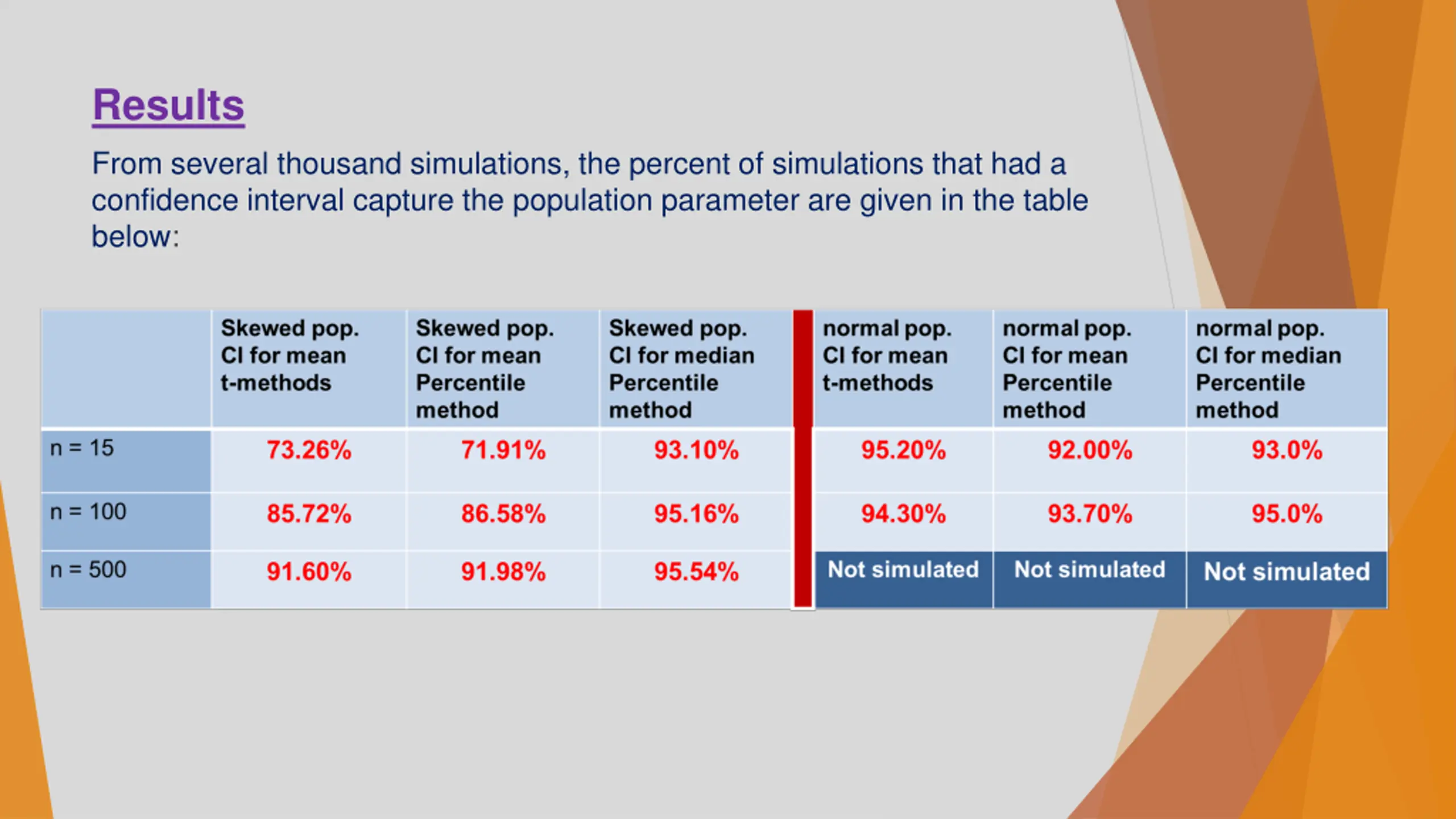 Results From several thousand simulations, the percent of simulations that had a confidence interval capture the population parameter are given in the table below: