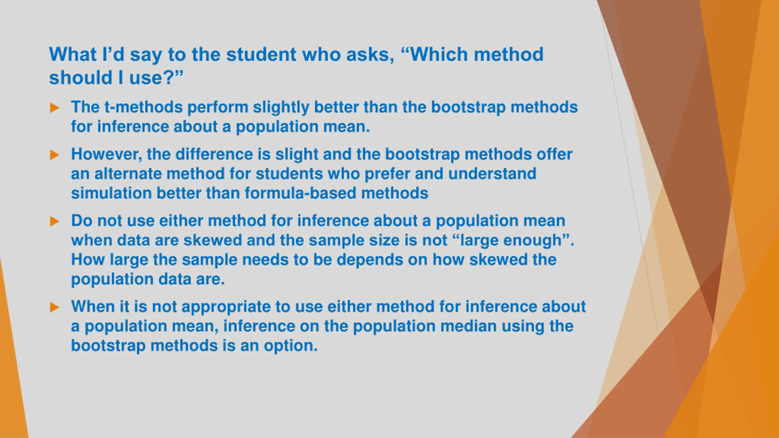 What Id say to the student who asks, Which method should I use? The t-methods perform slightly better than the bootstrap methods for inference about a population mean. However, the difference is slight and the bootstrap methods offer an alternate method for students who prefer and understand simulation better than formula-based methods Do not use either method for inference about a population mean when data are skewed and the sample size is not large enough . How large the sample needs to be depends on how skewed the population data are. When it is not appropriate to use either method for inference about a population mean, inference on the population median using the bootstrap methods is an option.