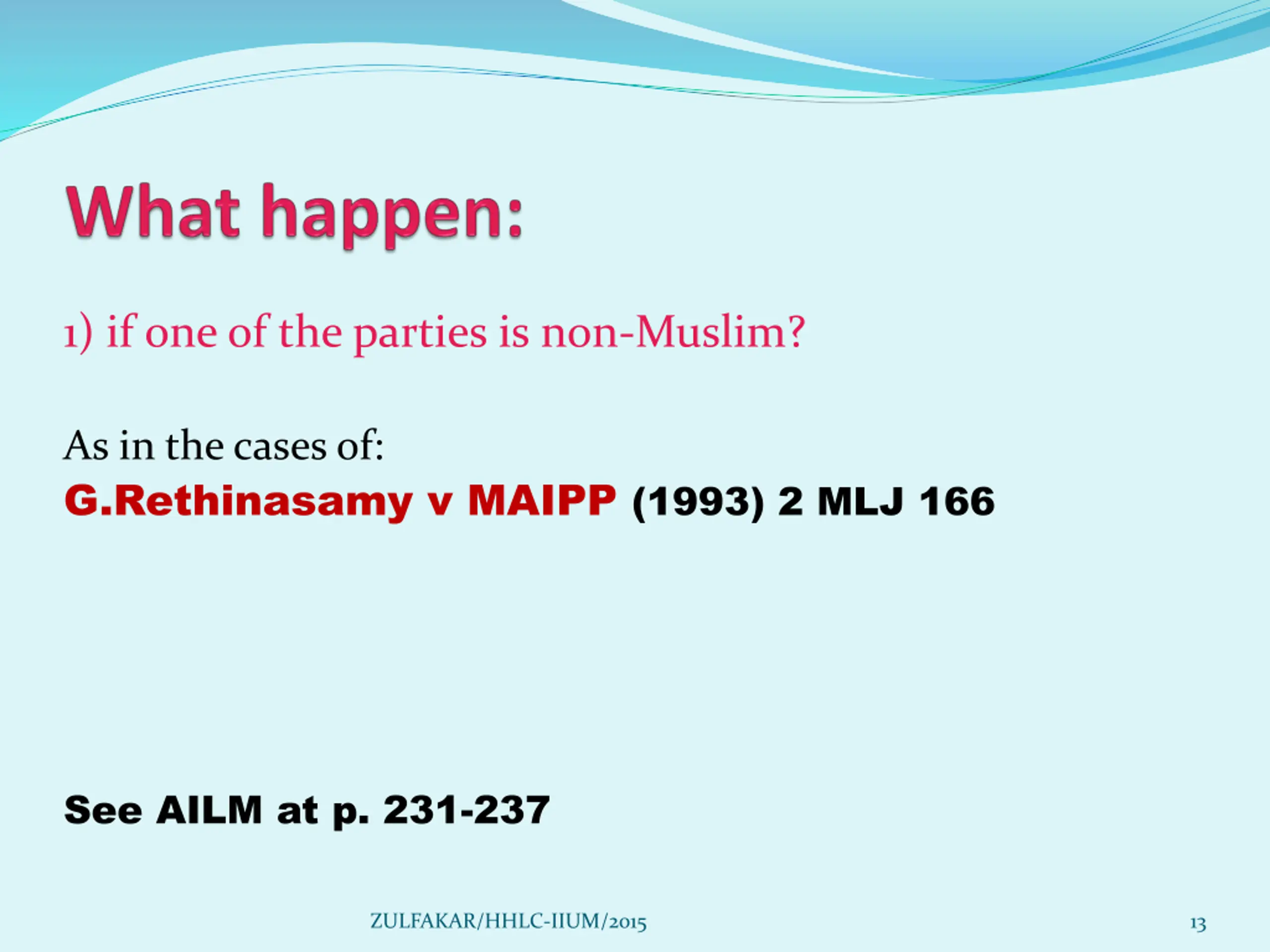 1) if one of the parties is non-Muslim? As in the cases of: G.Rethinasamy v MAIPP (1993) 2 MLJ 166 See AILM at p. 231-237 ZULFAKAR/HHLC-IIUM/2015 13