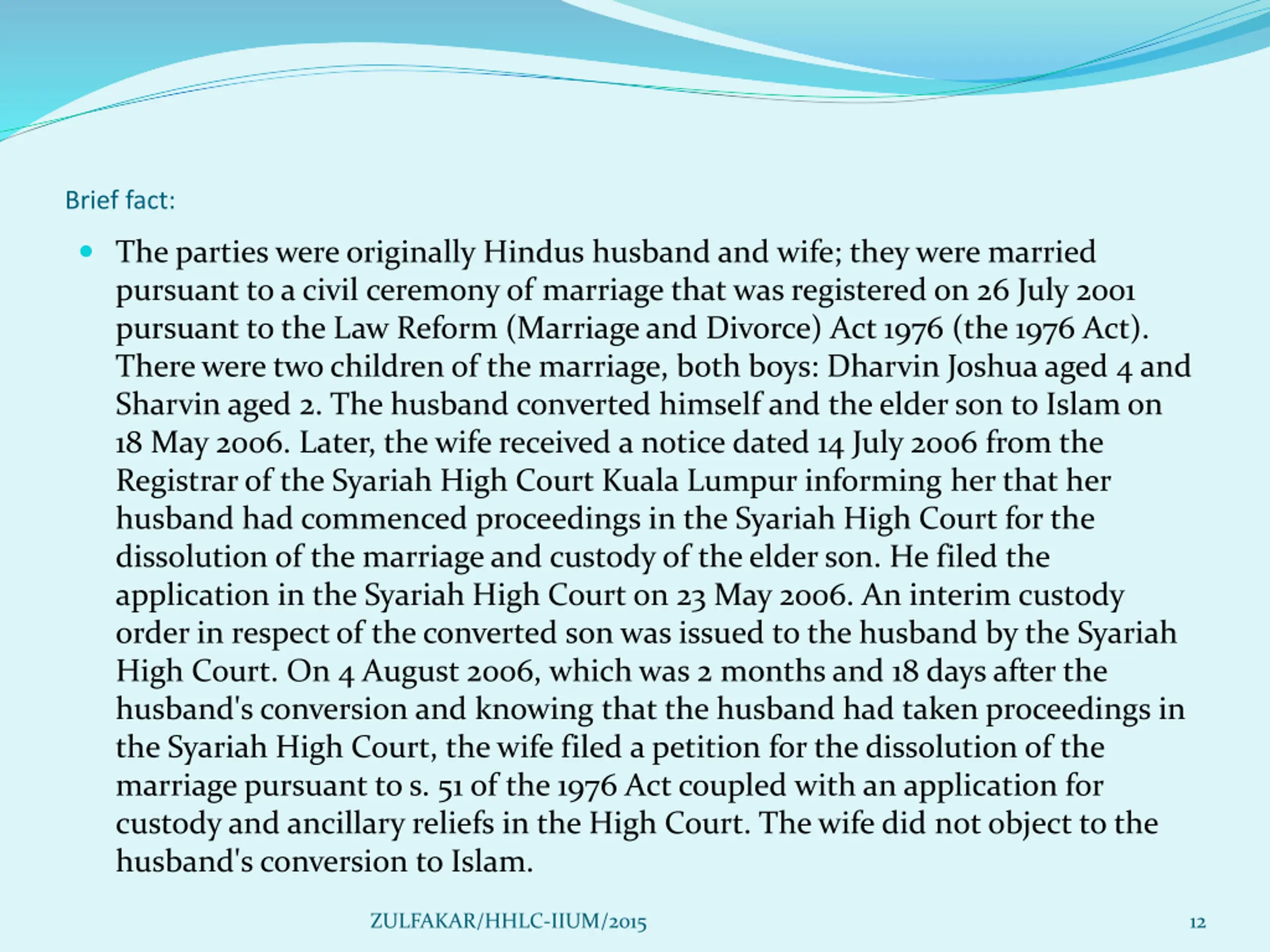 Brief fact: The parties were originally Hindus husband and wife; they were married pursuant to a civil ceremony of marriage that was registered on 26 July 2001 pursuant to the Law Reform (Marriage and Divorce) Act 1976 (the 1976 Act). There were two children of the marriage, both boys: Dharvin Joshua aged 4 and Sharvin aged 2. The husband converted himself and the elder son to Islam on 18 May 2006. Later, the wife received a notice dated 14 July 2006 from the Registrar of the Syariah High Court Kuala Lumpur informing her that her husband had commenced proceedings in the Syariah High Court for the dissolution of the marriage and custody of the elder son. He filed the application in the Syariah High Court on 23 May 2006. An interim custody order in respect of the converted son was issued to the husband by the Syariah High Court. On 4 August 2006, which was 2 months and 18 days after the husband's conversion and knowing that the husband had taken proceedings in the Syariah High Court, the wife filed a petition for the dissolution of the marriage pursuant to s. 51 of the 1976 Act coupled with an application for custody and ancillary reliefs in the High Court. The wife did not object to the husband's conversion to Islam. ZULFAKAR/HHLC-IIUM/2015 12