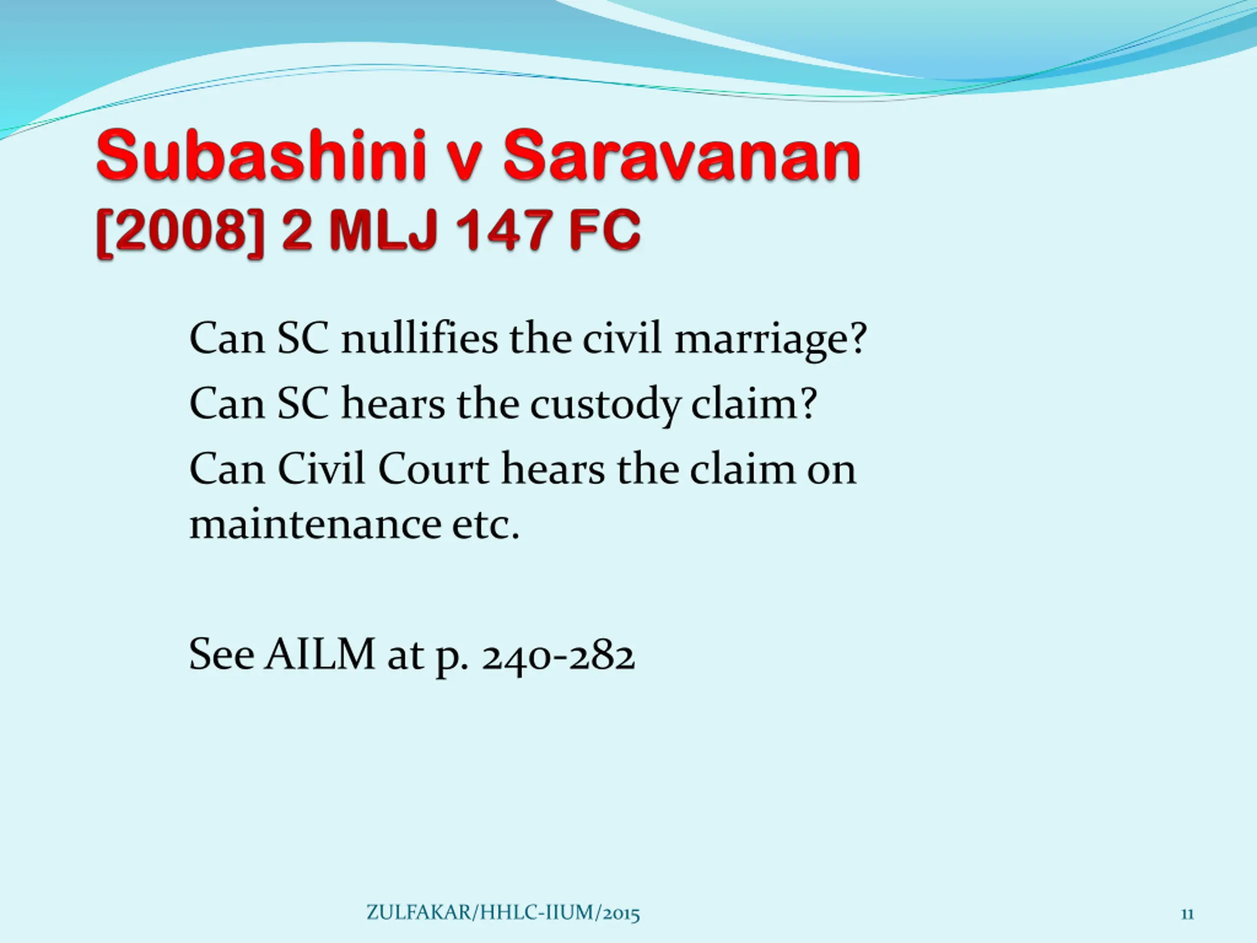 Can SC nullifies the civil marriage? Can SC hears the custody claim? Can Civil Court hears the claim on maintenance etc. See AILM at p. 240-282 ZULFAKAR/HHLC-IIUM/2015 11
