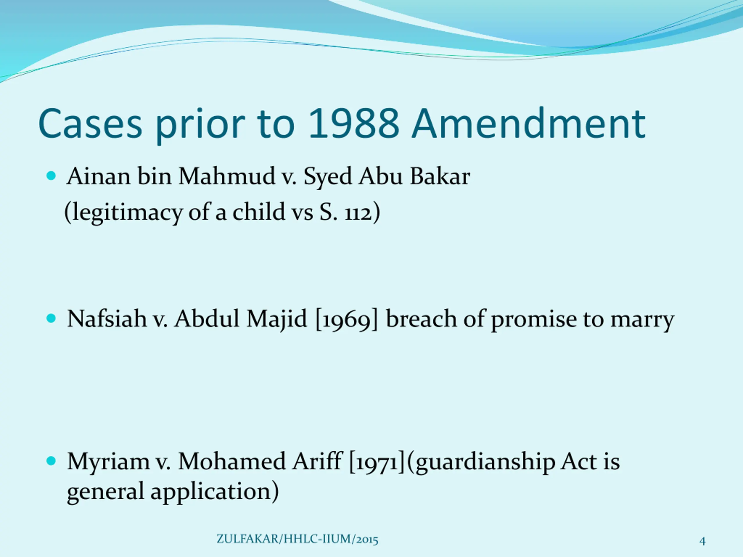 Cases prior to 1988 Amendment Ainan bin Mahmud v. Syed Abu Bakar (legitimacy of a child vs S. 112) Nafsiah v. Abdul Majid [1969] breach of promise to marry Myriam v. Mohamed Ariff [1971](guardianship Act is general application) ZULFAKAR/HHLC-IIUM/2015 4