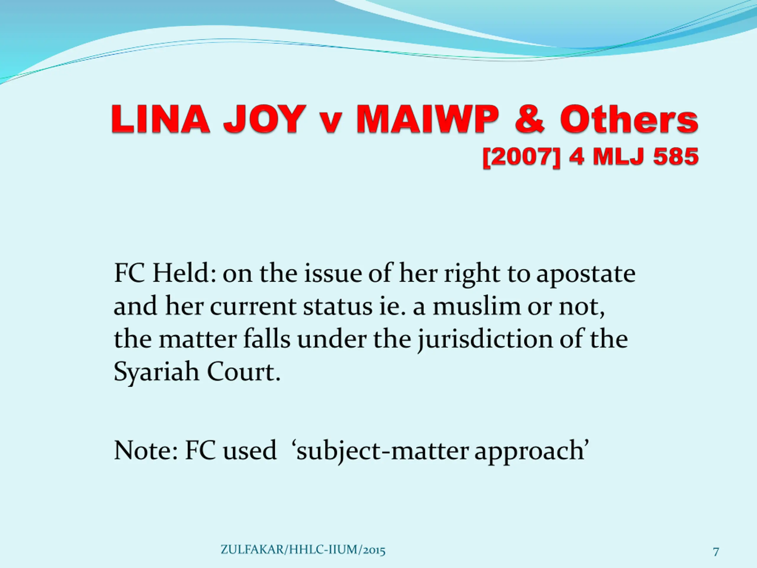 FC Held: on the issue of her right to apostate and her current status ie. a muslim or not, the matter falls under the jurisdiction of the Syariah Court. Note: FC used subject-matter approach ZULFAKAR/HHLC-IIUM/2015 7