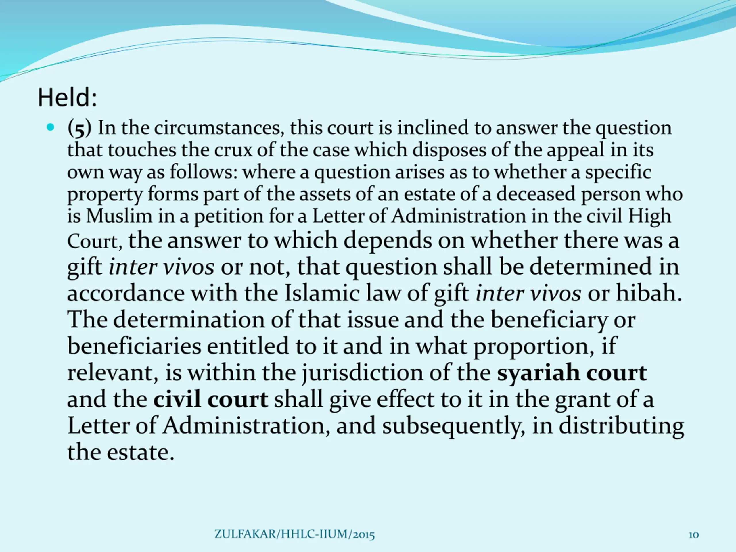 Held: (5) In the circumstances, this court is inclined to answer the question that touches the crux of the case which disposes of the appeal in its own way as follows: where a question arises as to whether a specific property forms part of the assets of an estate of a deceased person who is Muslim in a petition for a Letter of Administration in the civil High Court, the answer to which depends on whether there was a gift inter vivos or not, that question shall be determined in accordance with the Islamic law of gift inter vivos or hibah. The determination of that issue and the beneficiary or beneficiaries entitled to it and in what proportion, if relevant, is within the jurisdiction of the syariah court and the civil court shall give effect to it in the grant of a Letter of Administration, and subsequently, in distributing the estate. ZULFAKAR/HHLC-IIUM/2015 10