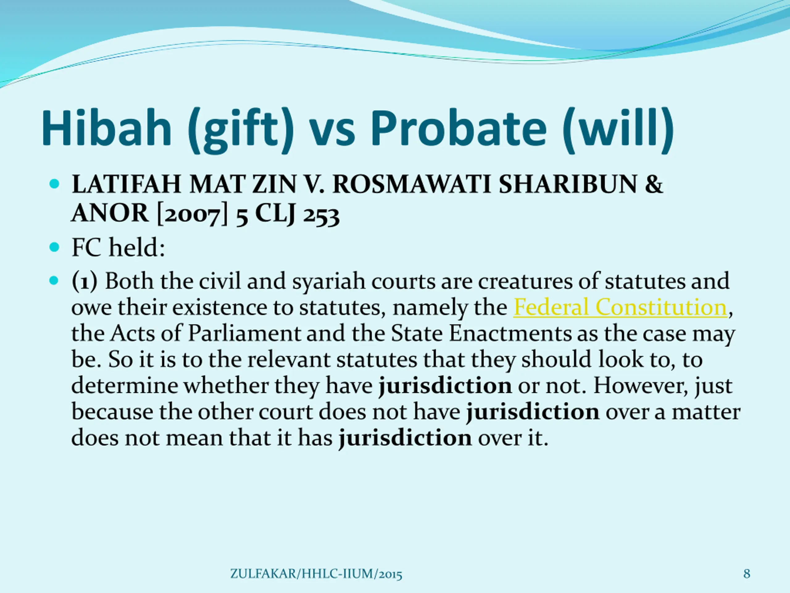 Hibah (gift) vs Probate (will) LATIFAH MAT ZIN V. ROSMAWATI SHARIBUN & ANOR [2007] 5 CLJ 253 FC held: (1) Both the civil and syariah courts are creatures of statutes and owe their existence to statutes, namely the Federal Constitution, the Acts of Parliament and the State Enactments as the case may be. So it is to the relevant statutes that they should look to, to determine whether they have jurisdiction or not. However, just because the other court does not have jurisdiction over a matter does not mean that it has jurisdiction over it. ZULFAKAR/HHLC-IIUM/2015 8