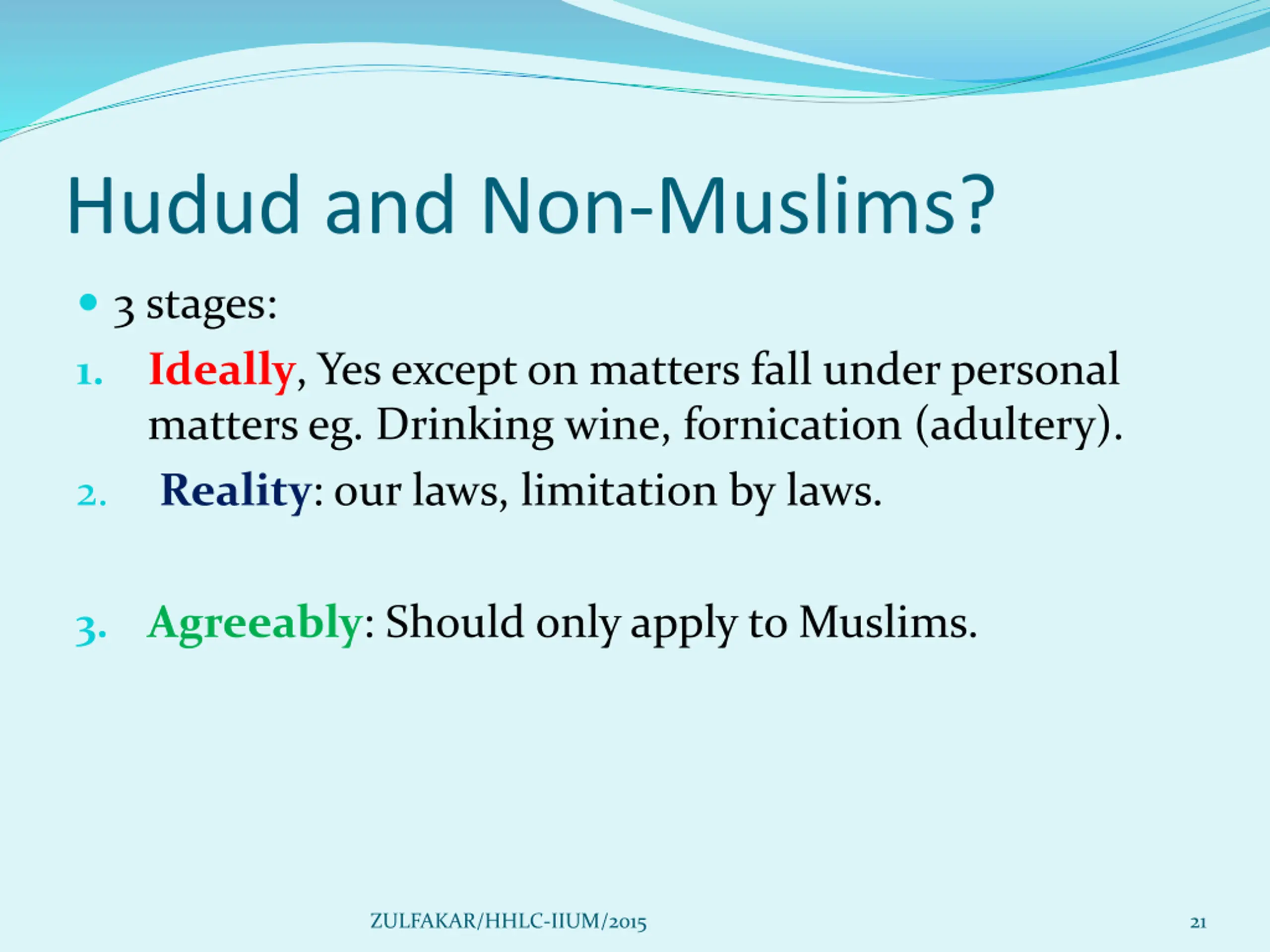 Hudud and Non-Muslims? 3 stages: Ideally, Yes except on matters fall under personal matters eg. Drinking wine, fornication (adultery). 2.Reality: our laws, limitation by laws. 1. 3. Agreeably: Should only apply to Muslims. ZULFAKAR/HHLC-IIUM/2015 21