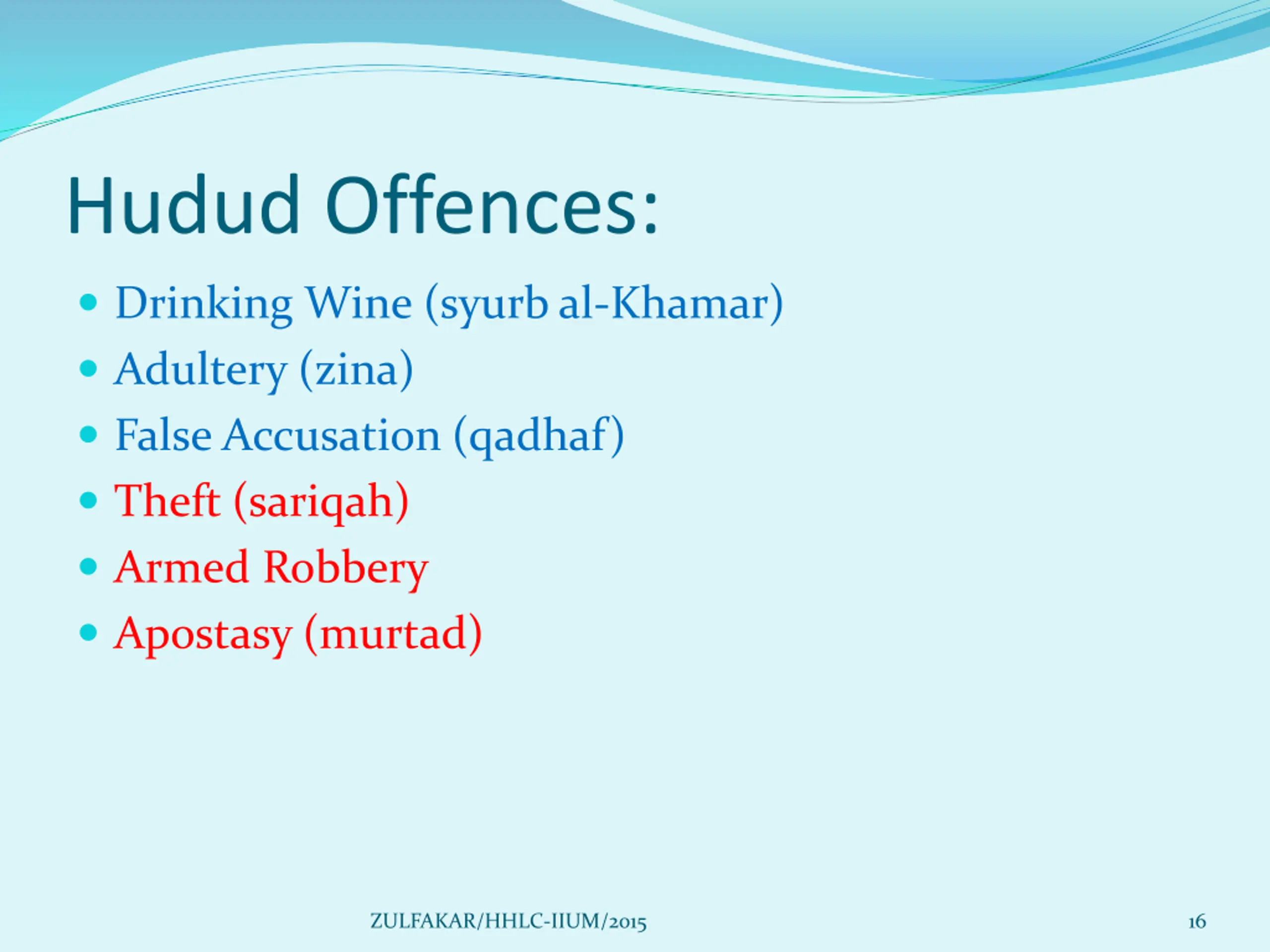 Hudud Offences: Drinking Wine (syurb al-Khamar) Adultery (zina) False Accusation (qadhaf) Theft (sariqah) Armed Robbery Apostasy (murtad) ZULFAKAR/HHLC-IIUM/2015 16