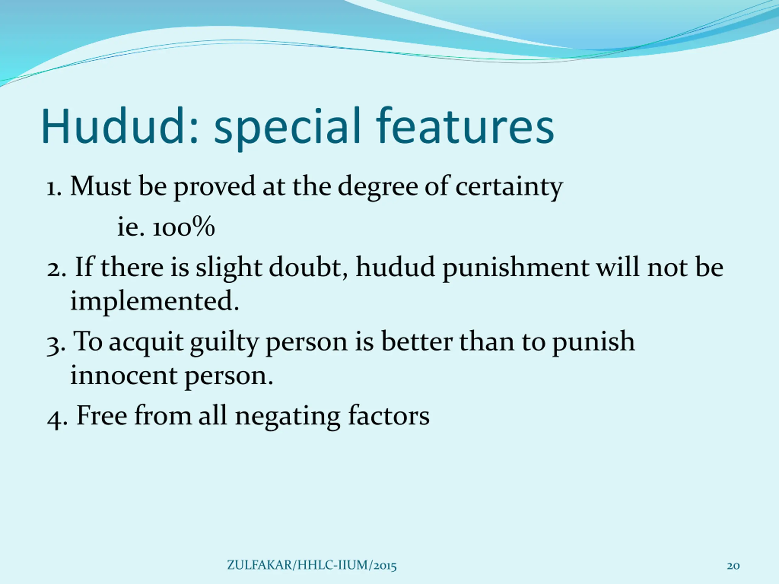 Hudud: special features 1. Must be proved at the degree of certainty ie. 100% 2. If there is slight doubt, hudud punishment will not be implemented. 3. To acquit guilty person is better than to punish innocent person. 4. Free from all negating factors ZULFAKAR/HHLC-IIUM/2015 20