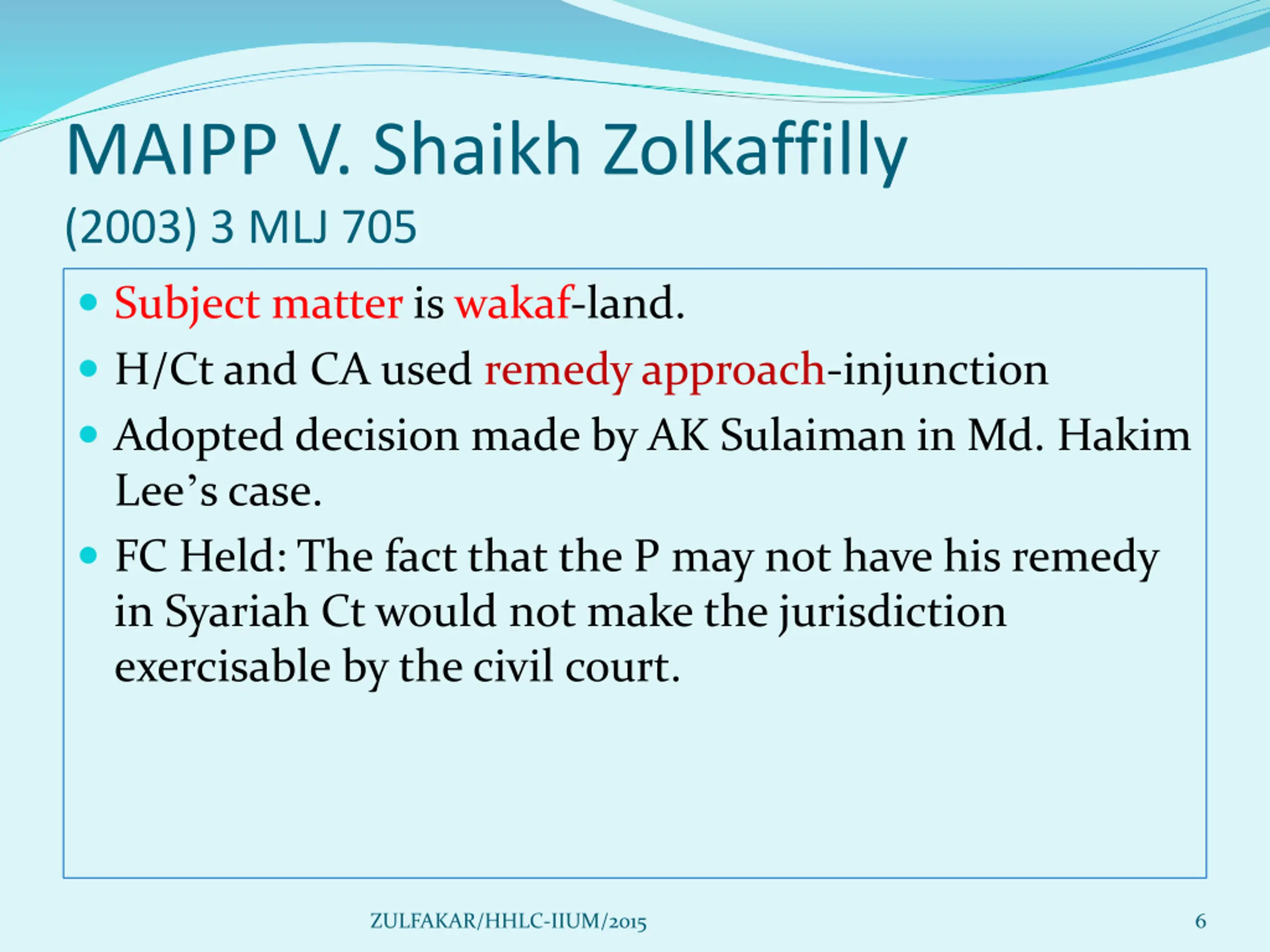 MAIPP V. Shaikh Zolkaffilly (2003) 3 MLJ 705 Subject matter is wakaf-land. H/Ct and CA used remedy approach-injunction Adopted decision made by AK Sulaiman in Md. Hakim Lee s case. FC Held: The fact that the P may not have his remedy in Syariah Ct would not make the jurisdiction exercisable by the civil court. ZULFAKAR/HHLC-IIUM/2015 6