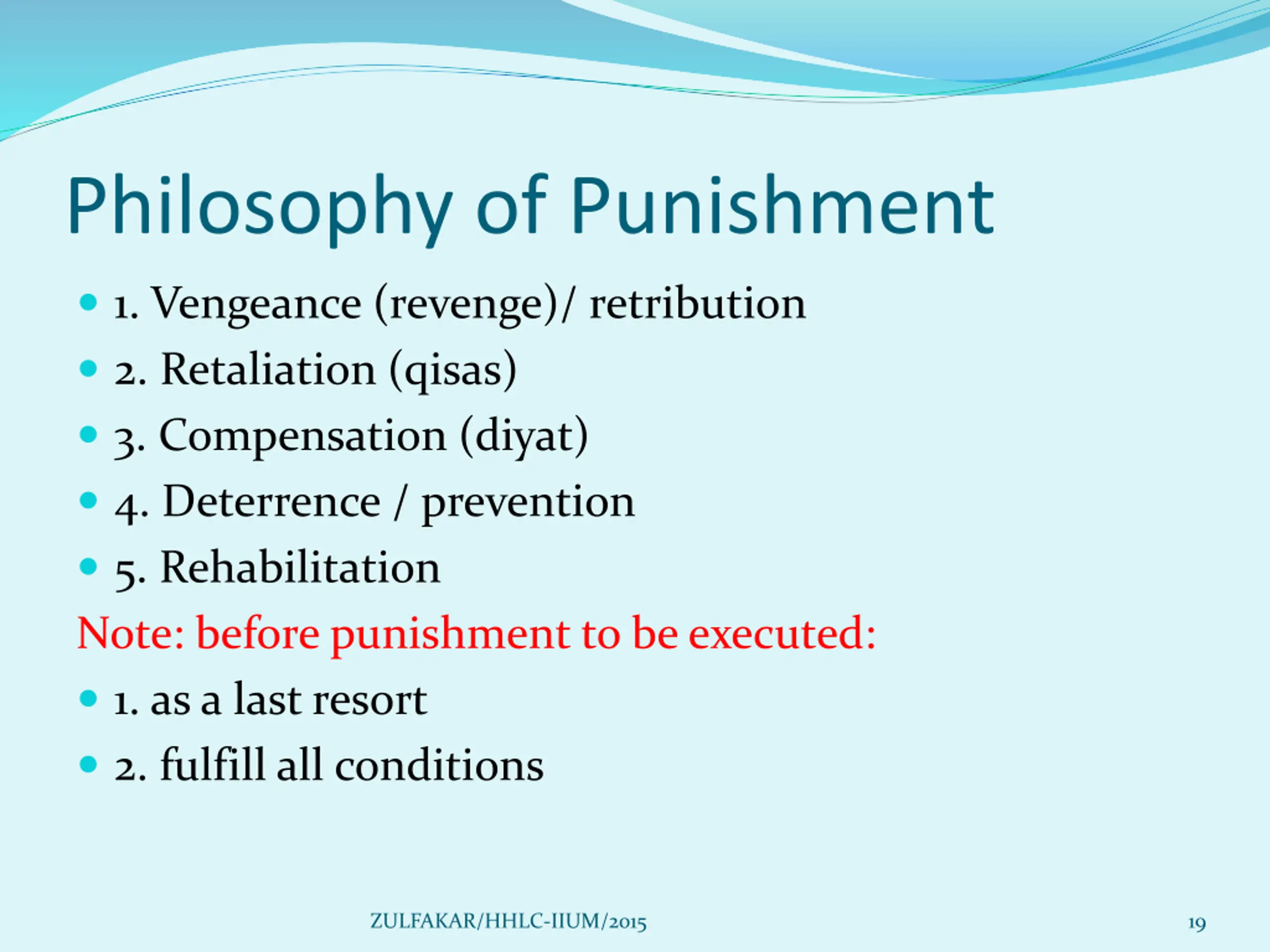 Philosophy of Punishment 1. Vengeance (revenge)/ retribution 2. Retaliation (qisas) 3. Compensation (diyat) 4. Deterrence / prevention 5. Rehabilitation Note: before punishment to be executed: 1. as a last resort 2. fulfill all conditions ZULFAKAR/HHLC-IIUM/2015 19