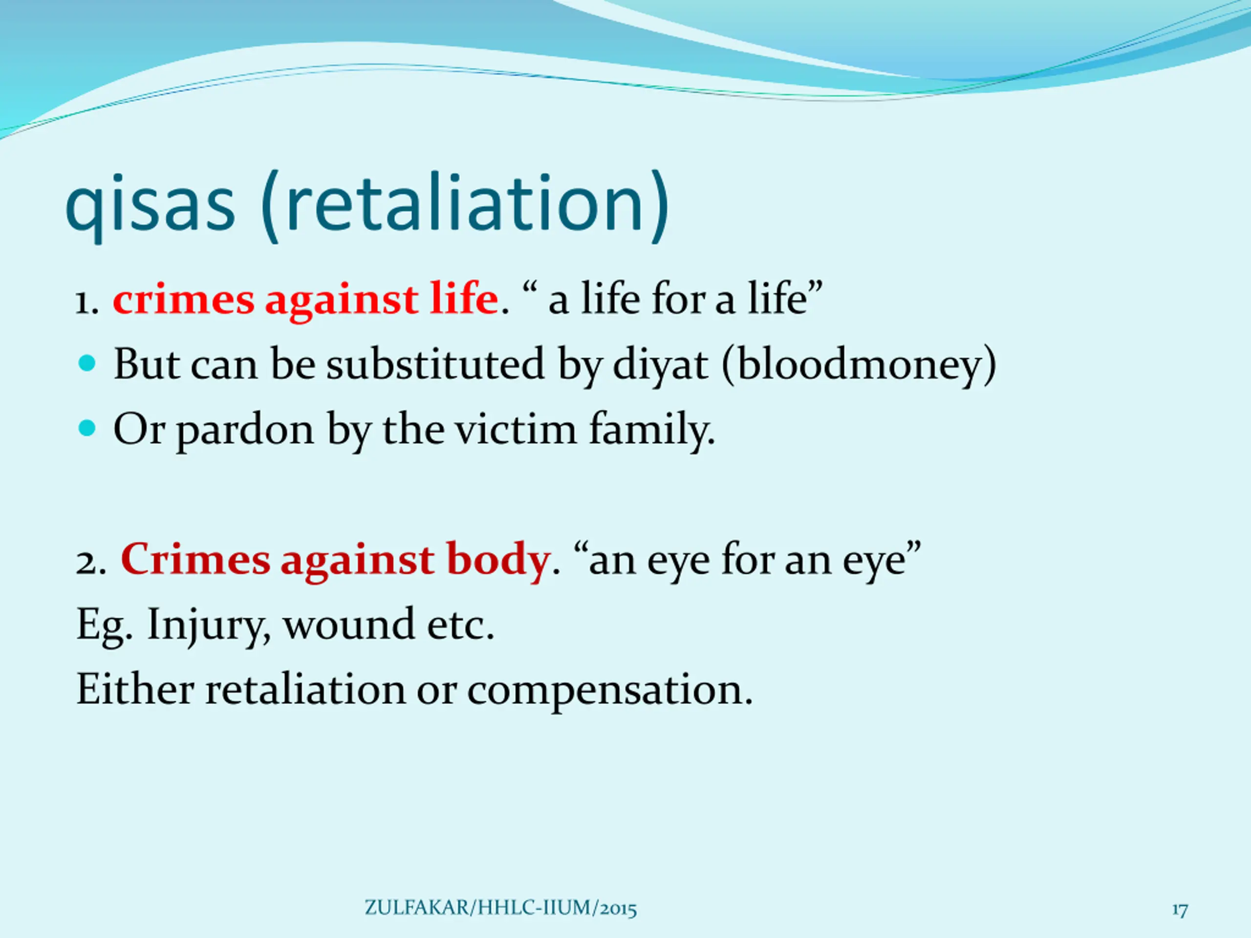 qisas (retaliation) 1. crimes against life. a life for a life But can be substituted by diyat (bloodmoney) Or pardon by the victim family. 2. Crimes against body. an eye for an eye Eg. Injury, wound etc. Either retaliation or compensation. ZULFAKAR/HHLC-IIUM/2015 17