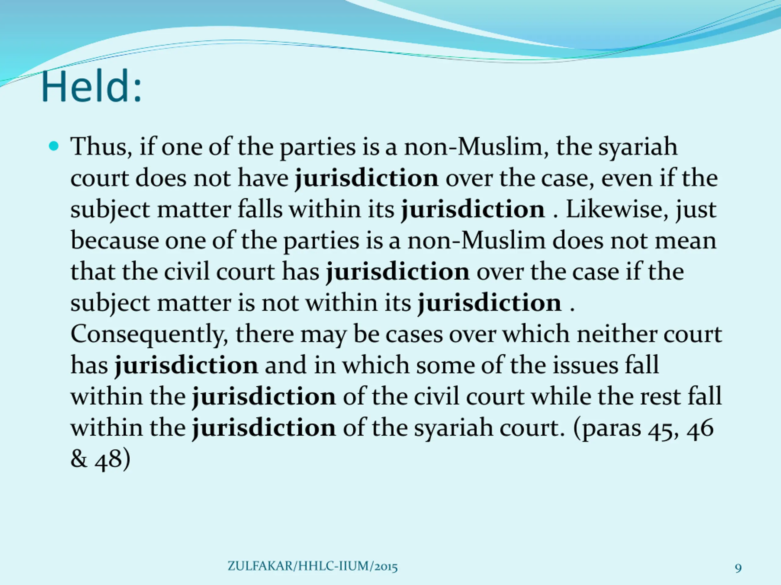 Held: Thus, if one of the parties is a non-Muslim, the syariah court does not have jurisdiction over the case, even if the subject matter falls within its jurisdiction . Likewise, just because one of the parties is a non-Muslim does not mean that the civil court has jurisdiction over the case if the subject matter is not within its jurisdiction . Consequently, there may be cases over which neither court has jurisdiction and in which some of the issues fall within the jurisdiction of the civil court while the rest fall within the jurisdiction of the syariah court. (paras 45, 46 & 48) ZULFAKAR/HHLC-IIUM/2015 9