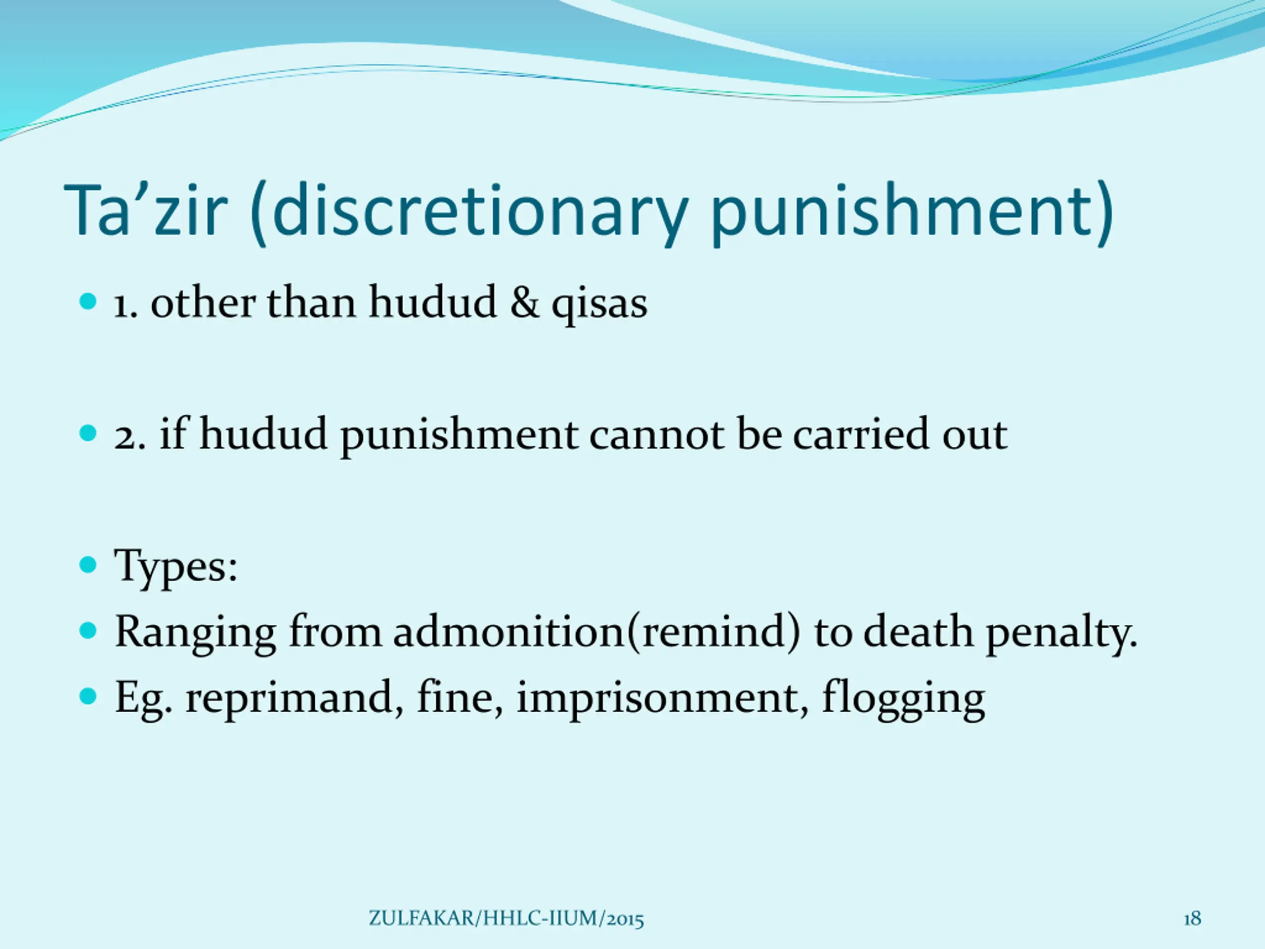 Tazir (discretionary punishment) 1. other than hudud & qisas 2. if hudud punishment cannot be carried out Types: Ranging from admonition(remind) to death penalty. Eg. reprimand, fine, imprisonment, flogging ZULFAKAR/HHLC-IIUM/2015 18