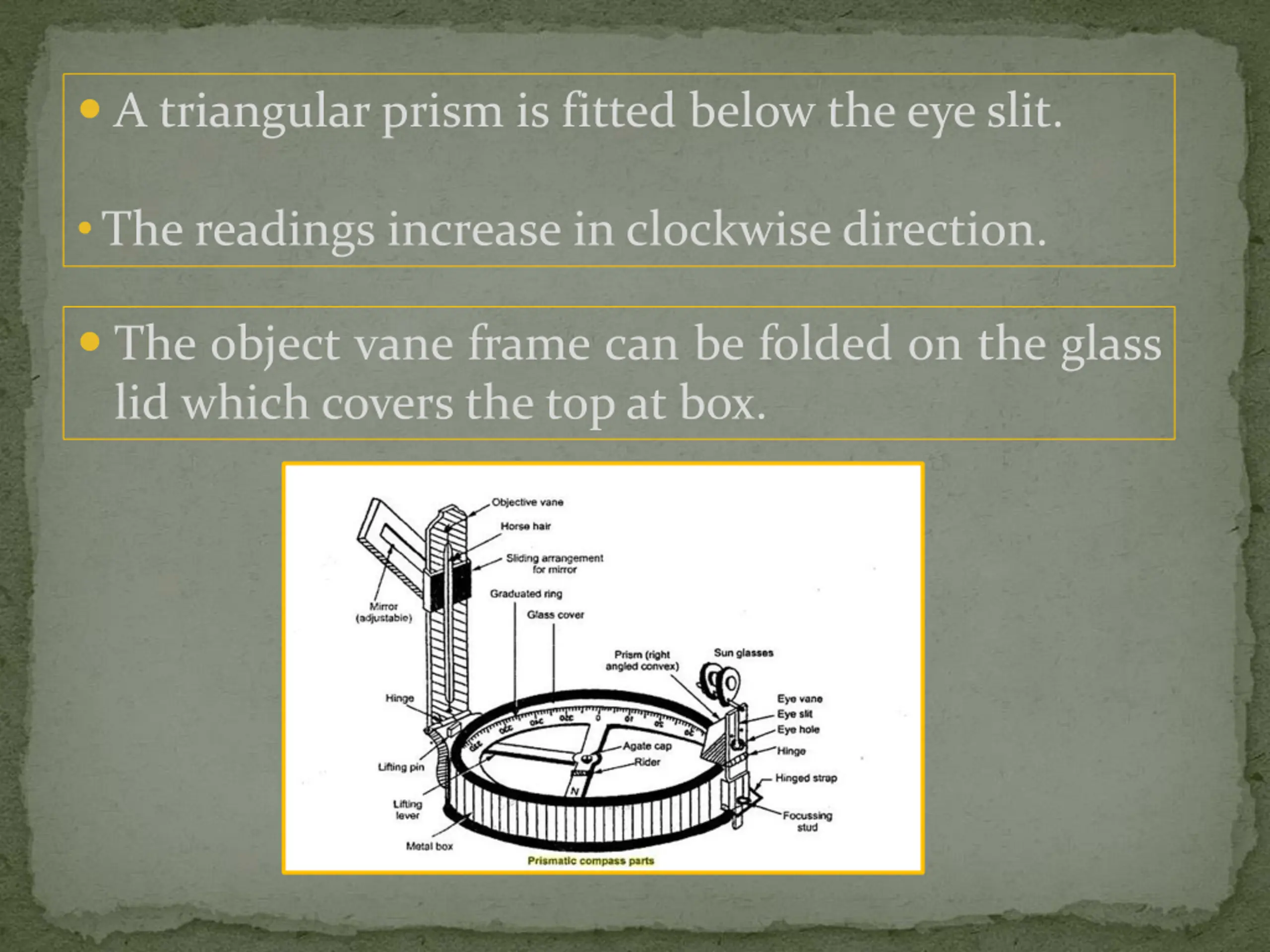 A triangular prism is fitted below the eye slit. The readings increase in clockwise direction. The object vane frame can be folded on the glass lid which covers the top at box.