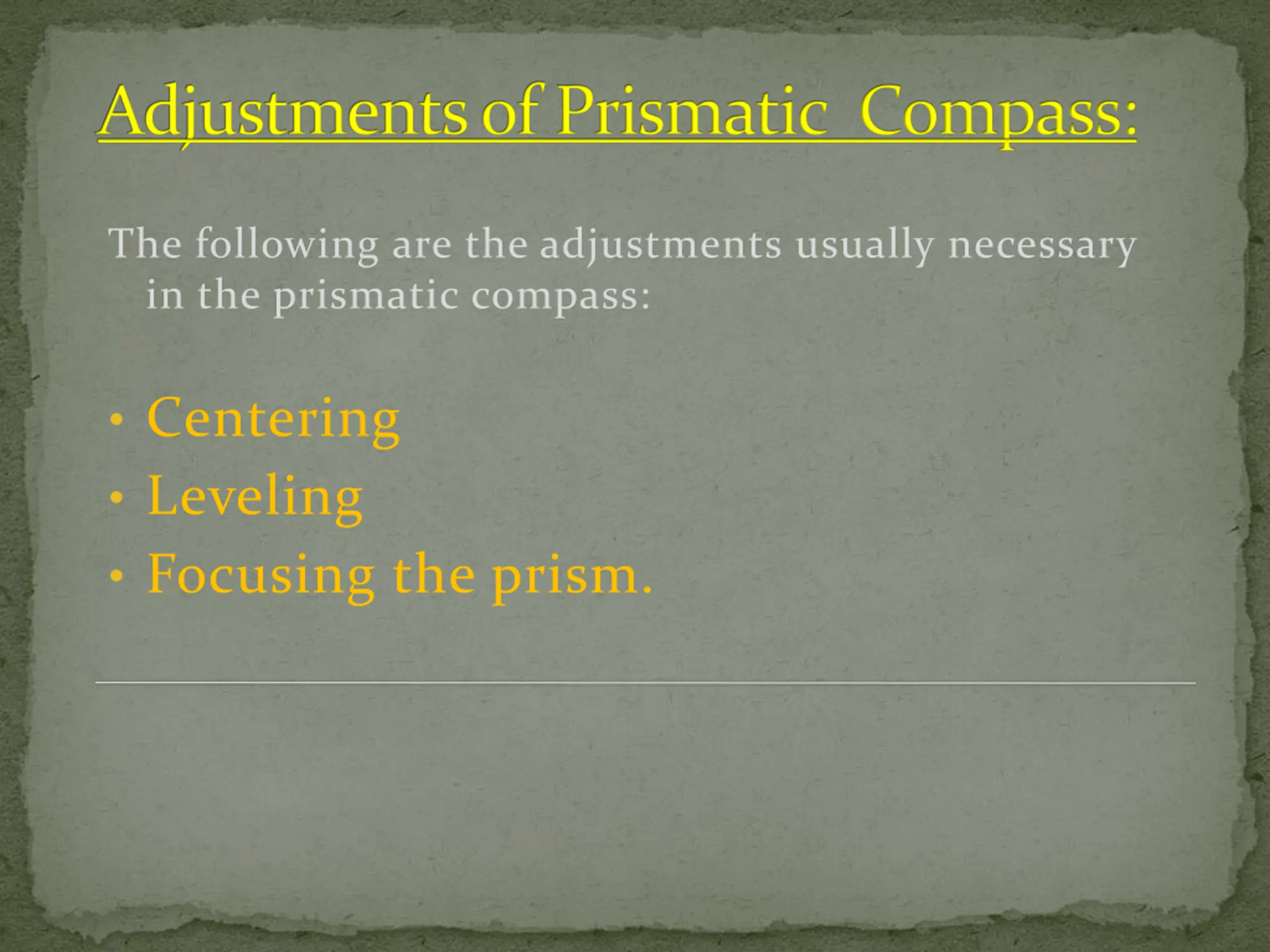 Adjustments of Prismatic Compass: The following are the adjustments usually necessary in the prismatic compass: Centering Leveling Focusing the prism.