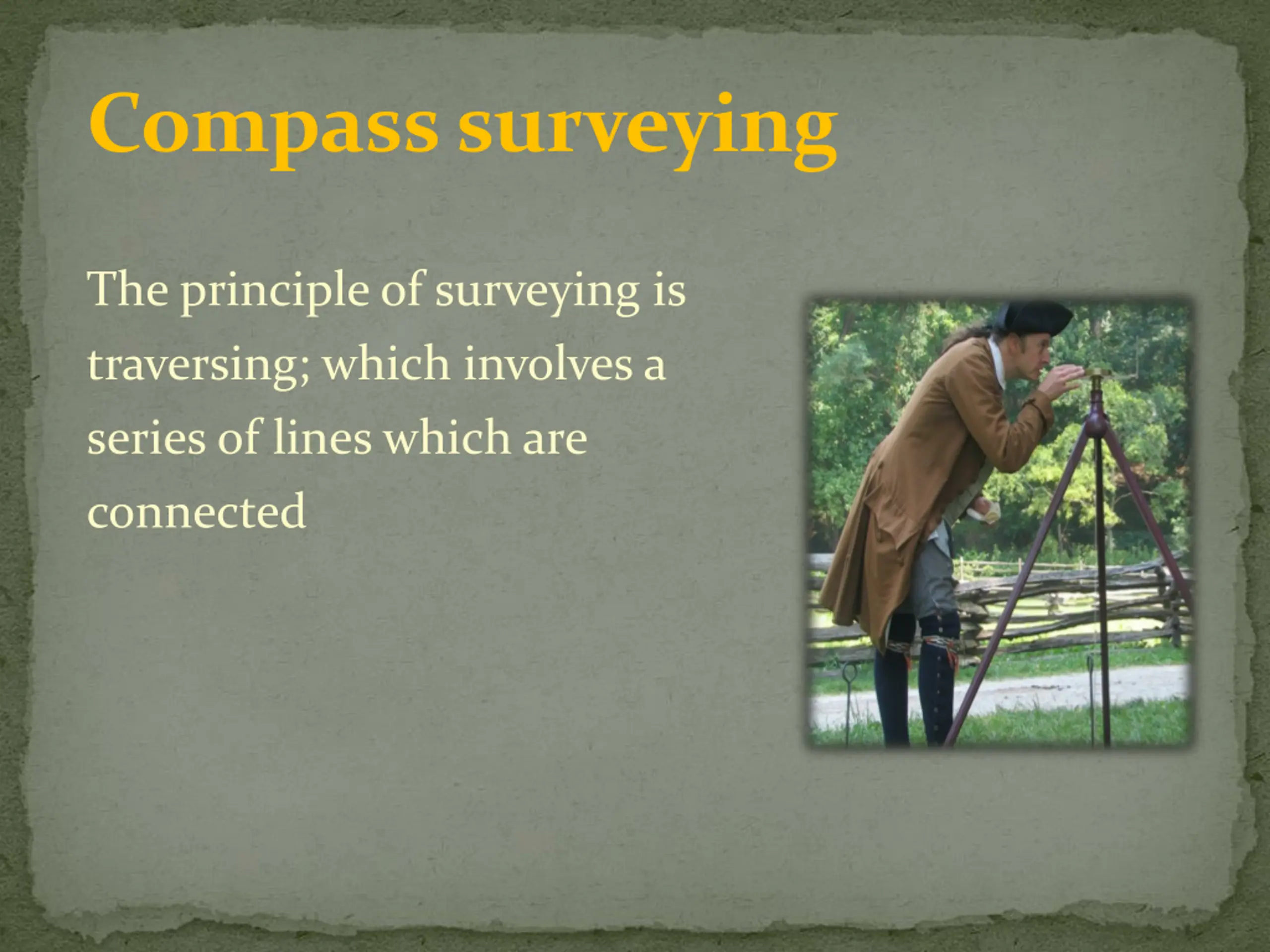 Compass surveying The principle of surveying is traversing; which involves a series of lines which are connected