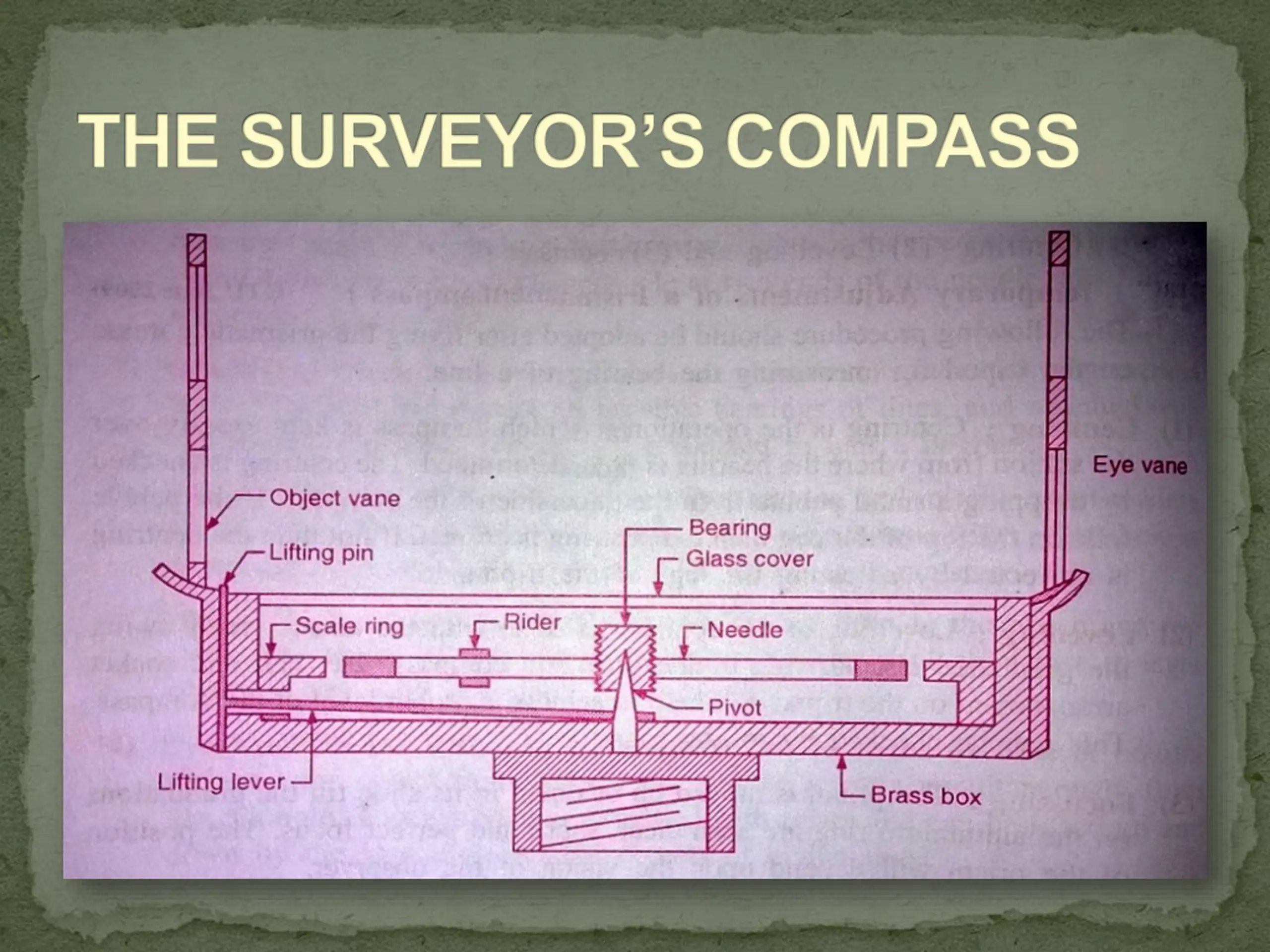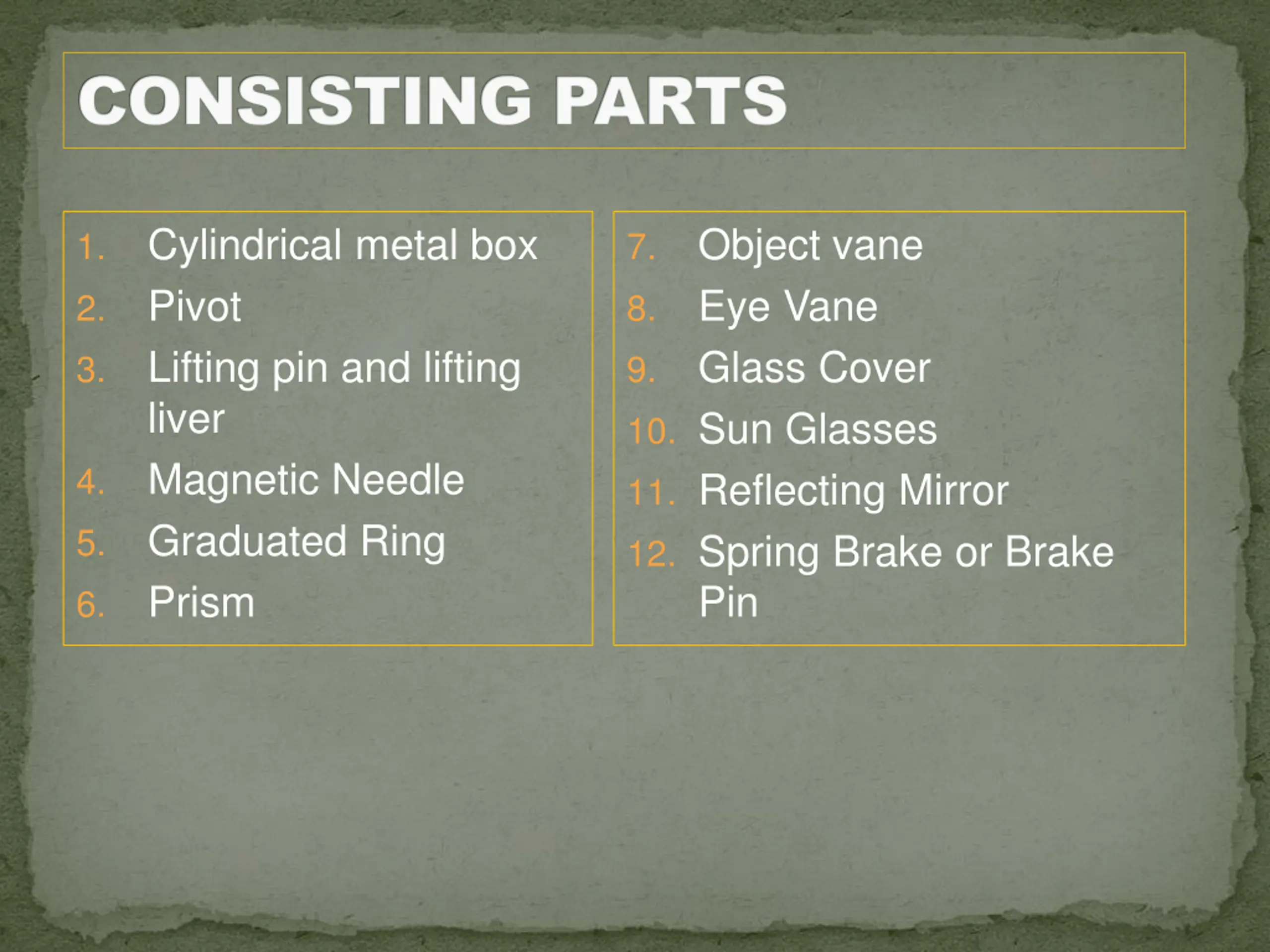 CONSISTING PARTS Cylindrical metal box Pivot Lifting pin and lifting liver Magnetic Needle Graduated Ring Prism Object vane Eye Vane Glass Cover 10. Sun Glasses 11. Reflecting Mirror 12. Spring Brake or Brake Pin 1. 7. 2. 8. 3. 9. 4. 5. 6.