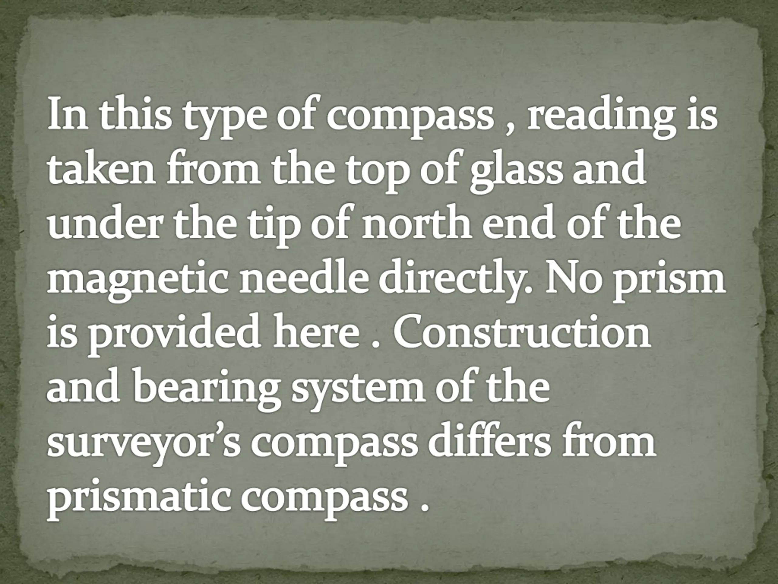 In this type of compass , reading is taken from the top of glass and under the tip of north end of the magnetic needle directly. No prism is provided here . Construction and bearing system of the surveyor s compass differs from prismatic compass .