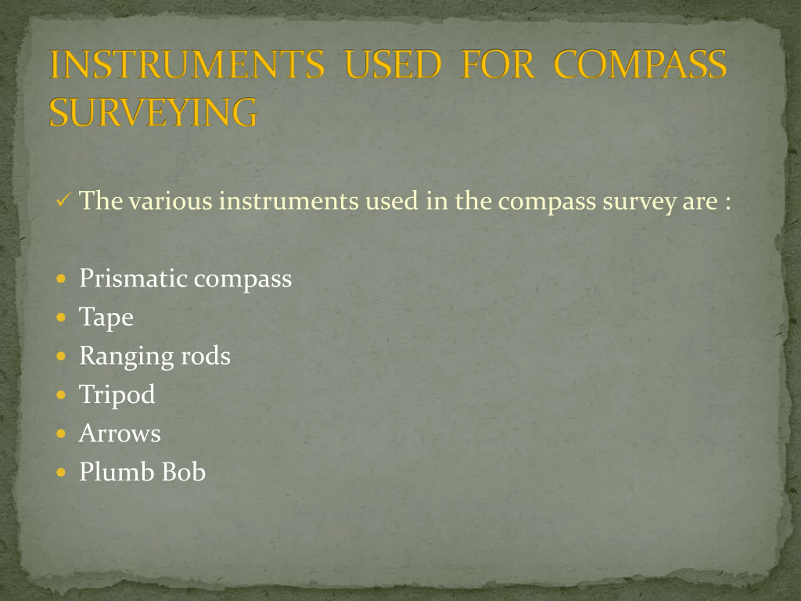 INSTRUMENTS USED FOR COMPASS SURVEYING The various instruments used in the compass survey are : Prismatic compass Tape Ranging rods Tripod Arrows Plumb Bob
