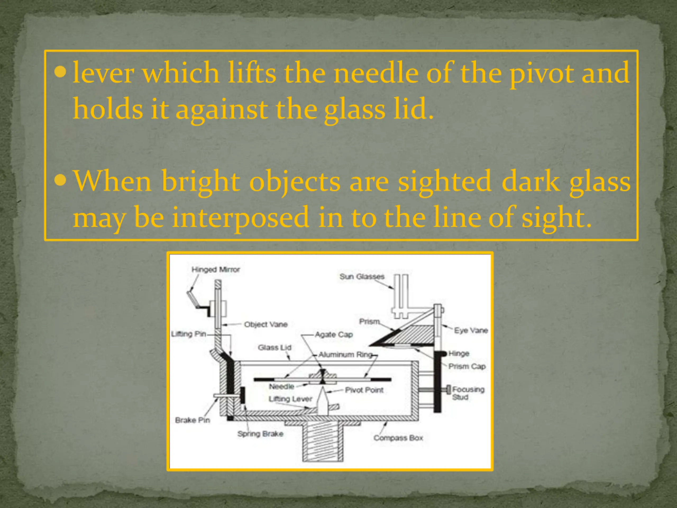 lever which lifts the needle of the pivot and holds it against the glass lid. When bright objects are sighted dark glass may be interposed in to the line of sight.