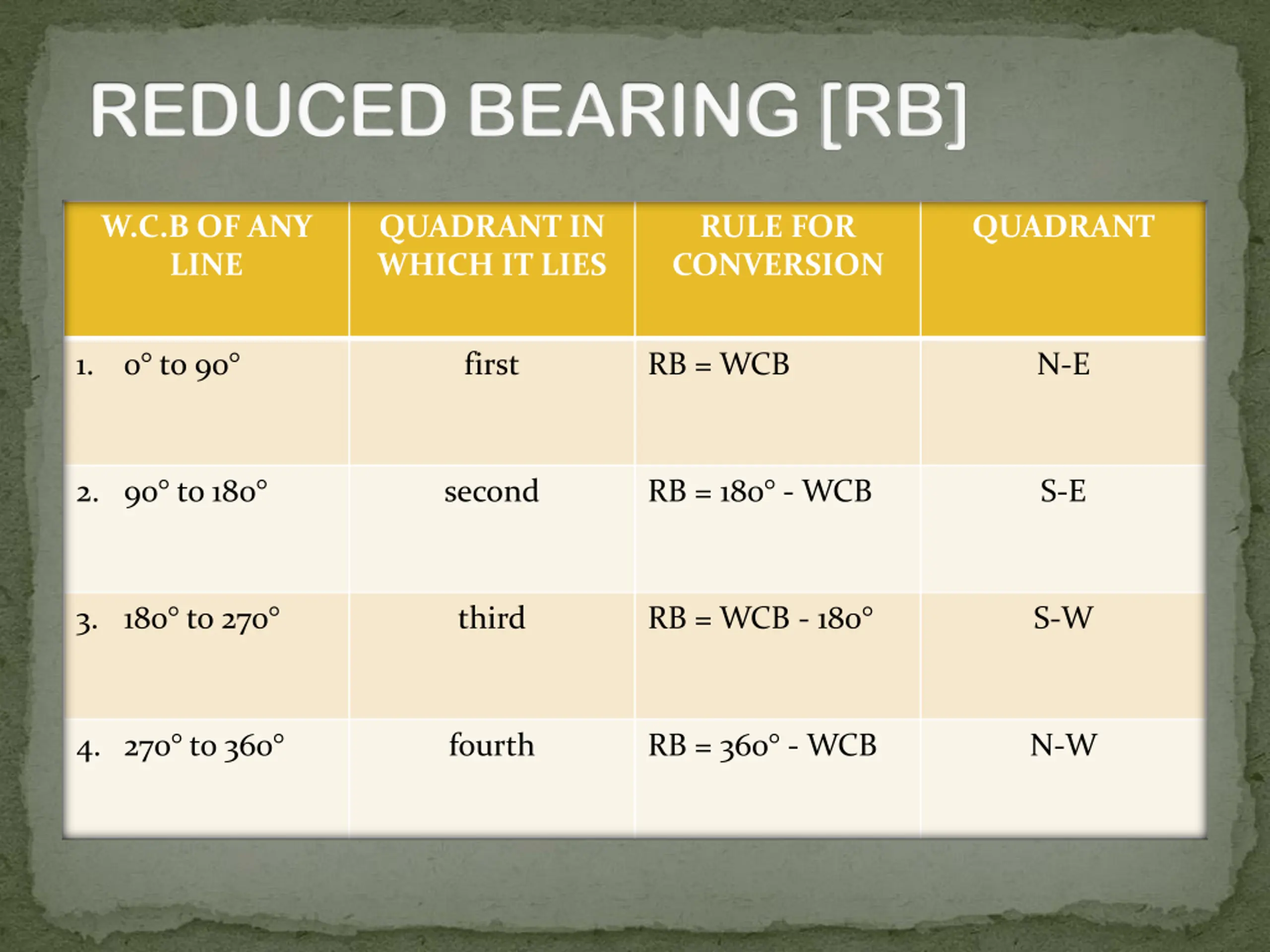 REDUCED BEARING [RB] W.C.B OF ANY LINE QUADRANT IN WHICH IT LIES RULE FOR CONVERSION QUADRANT 1. 0 to 90 first RB = WCB N-E 2. 90 to 180 second RB = 180 - WCB S-E 3. 180 to 270 third RB = WCB - 180 S-W 4. 270 to 360 fourth RB = 360 - WCB N-W