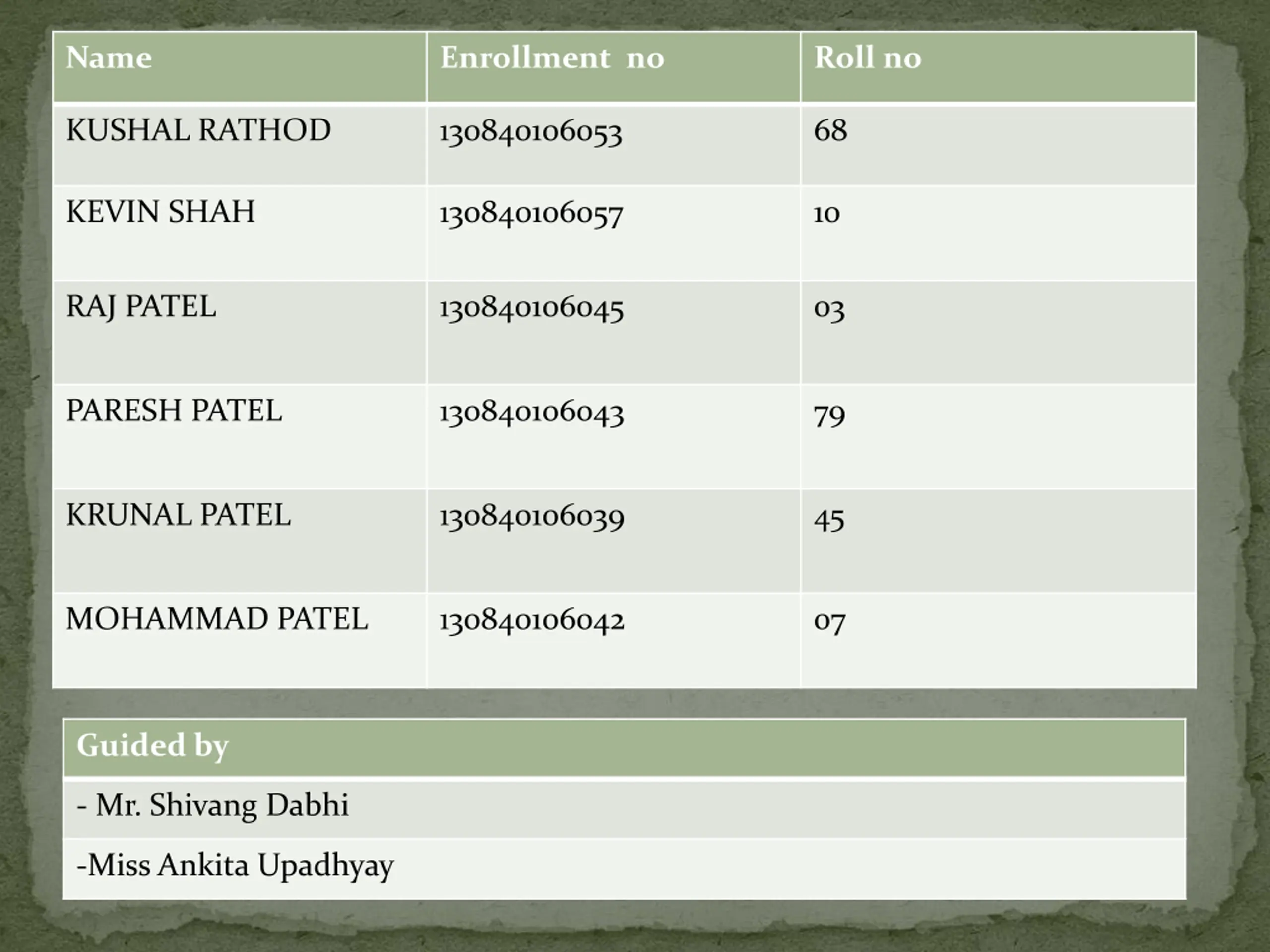 Name Enrollment no Roll no KUSHAL RATHOD 130840106053 68 KEVIN SHAH 130840106057 10 RAJ PATEL 130840106045 03 PARESH PATEL 130840106043 79 KRUNAL PATEL 130840106039 45 MOHAMMAD PATEL 130840106042 07 Guided by - Mr. Shivang Dabhi -Miss Ankita Upadhyay
